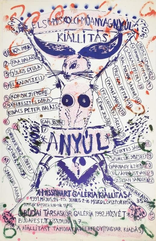 Swierkiewicz Róbert (1942-2019): Első Miskolci Műanyagnyúl Kiállítás, 1991. Litográfia, papír. Jelzett. Művészpéldány e.a. jelzéssel. 97x65 cm. Kiállítási plakát, amelyen Swierkiewicz Róbert neve mellett többek közt a következő művészeké is olvasható: Bukta Imre, El Kazovszkij, Wahorn András, ef Zámbó István, feLugossy László, Szurcsik József, Gaál József. Legendás kiállítás, gyűjtői ritkaság!/ lithograph on paper, signed, artist's proof, exhibition poster from 1991.