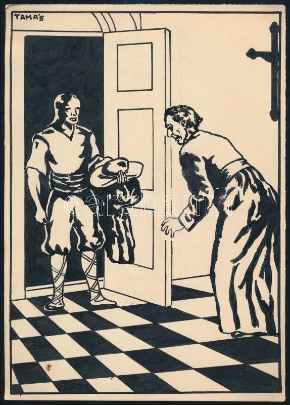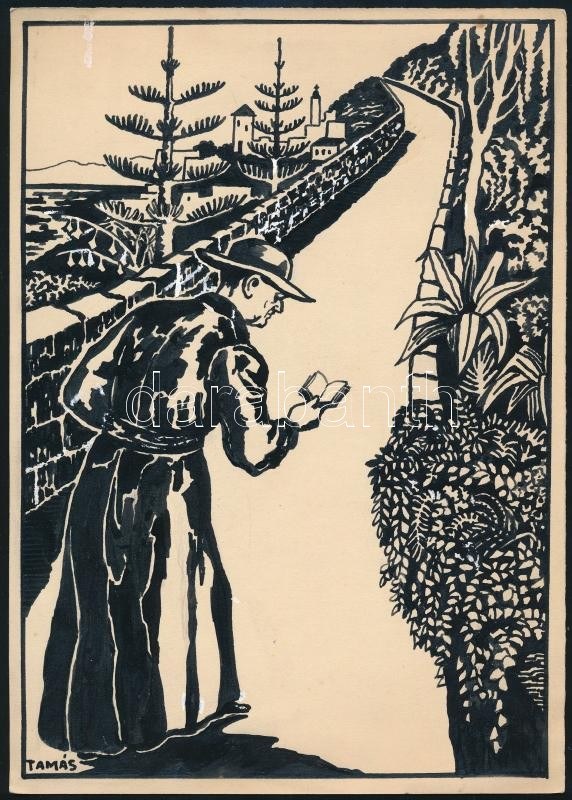 Tamás jelzéssel: Manzoni: Jegyesek c. mukájához készült 4 db illusztráció. Tus, vegyes technika...