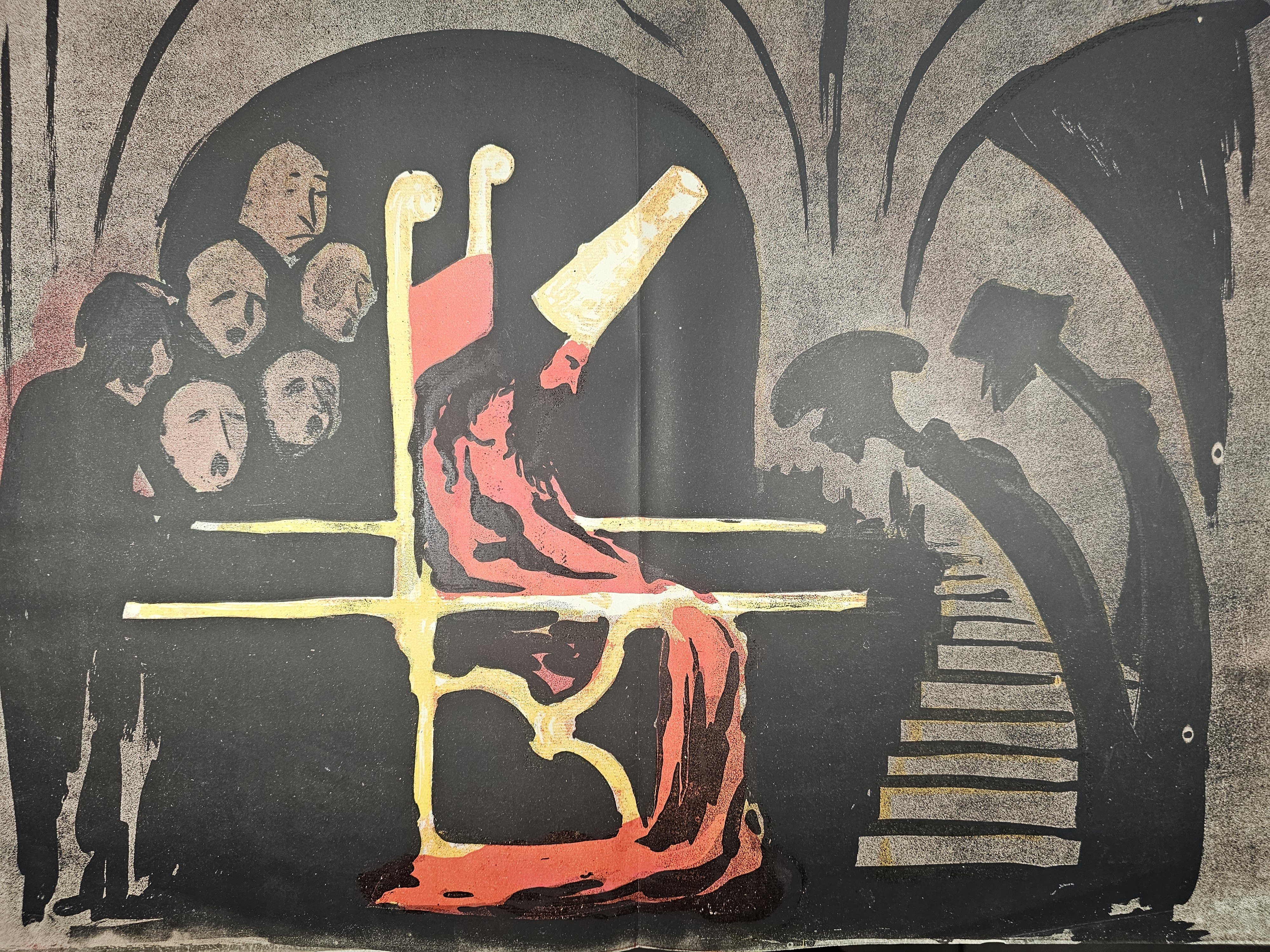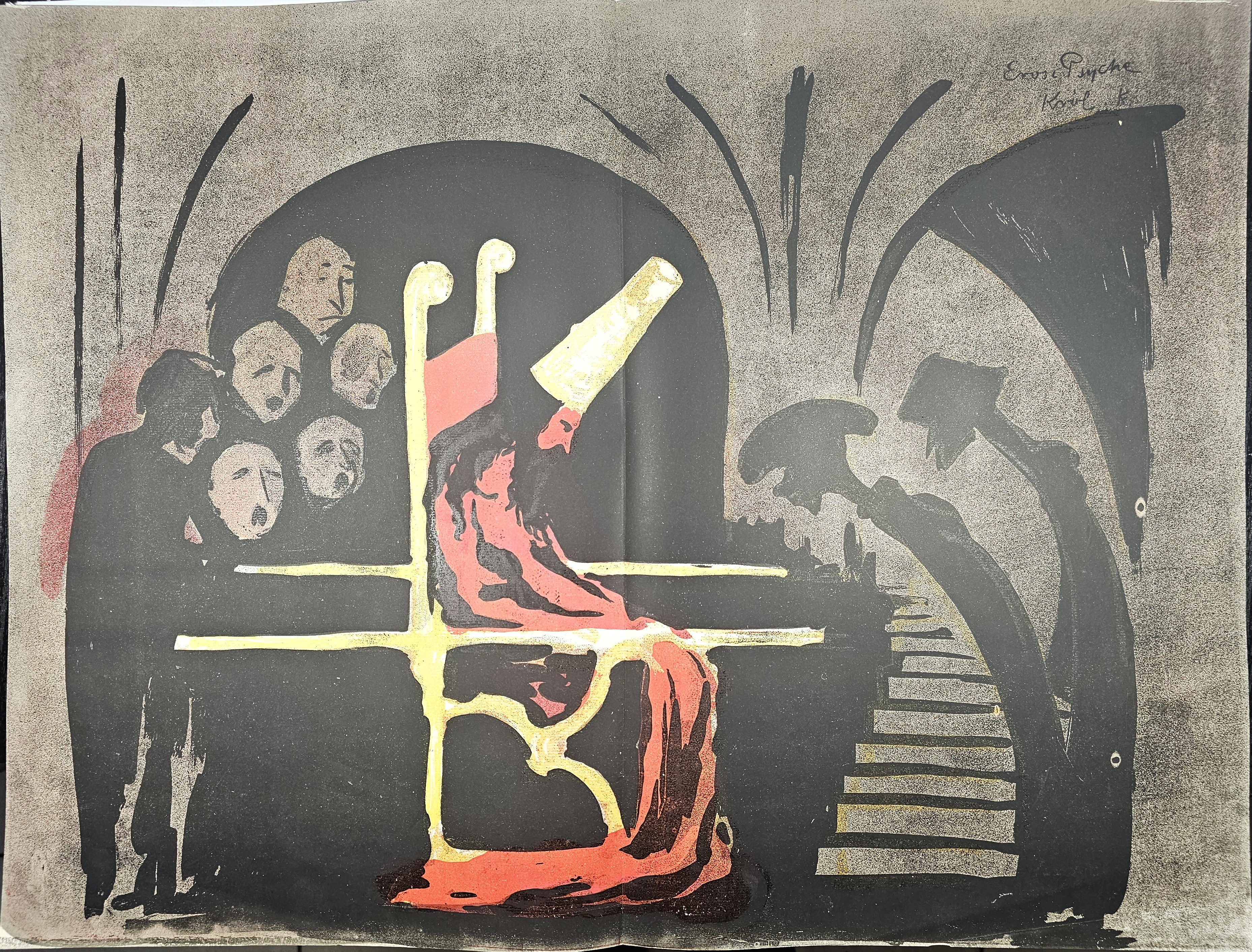 Karykatura, litografia, sygnowana na płycie p.g.: Eros i Psyche. Król. KF; wym.: 45 x 59 cm, karta złożona na pół, stan bardzo dobry. Rycina pochodzi z "Teka Melpomeny" wyd. w Krakowie w 1904 r. w Zakł. Litogr. A. Pruszyńskiego.