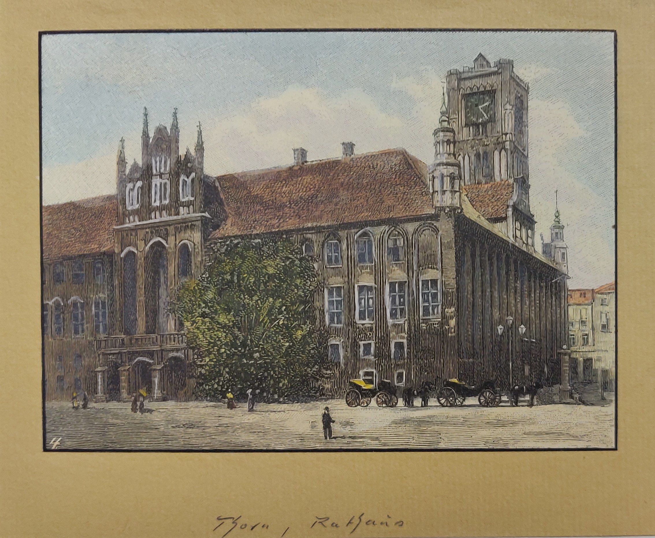 TORUŃ. Ratusz; anonim, ok. 1870; drzew. szt. kolor., podklejony papierem, st. bdb.; wym.: 124x91 mm; tyt. odręcznie: Thorn, Rathaus;