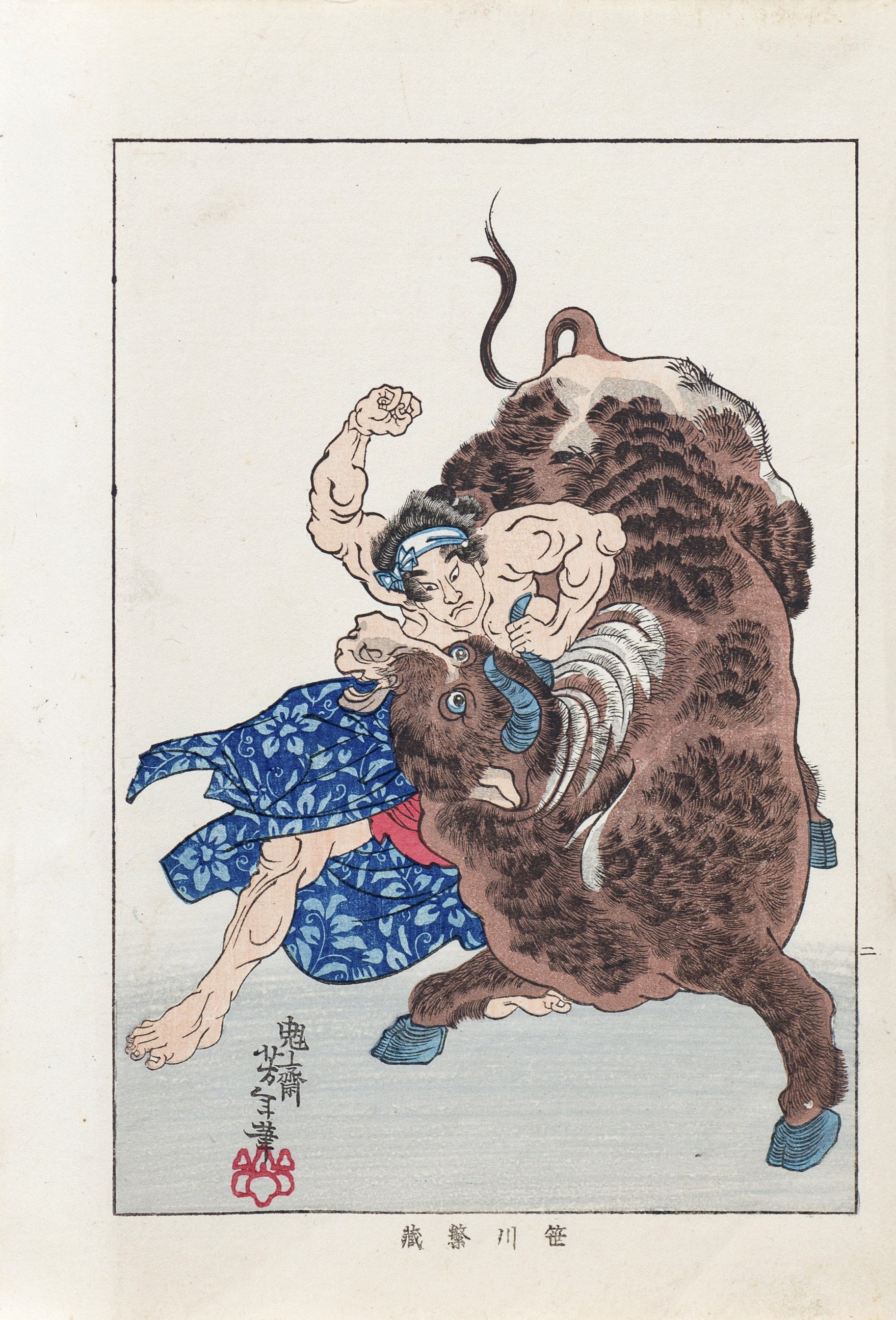 Drzeworyt pochodzi z serii „Biografie współczesnych mężczyzn”zaprojektowanej przez Yoshitoshiego w latach 60. XIX w., a wydanej w 1920 r. w uproszczonej i pomniejszonej formie jako sashi-e (drzeworytnicza ilustracja) do albumu „Kinsei Kyogiden”. Seria pochodzi z dość wczesnego okresu kariery Yoshitoshiego, kiedy miał około dwudziestu sześciu lat, dwie dekady przed powstaniem jego znanych arcydzieł, takich jak wielka seria „Sto aspektów księżyca” (1885-1892) oraz „Nowe formy trzydziestu sześciu duchów” (często nazywana po prostu „Trzydzieści sześć duchów”) (1889-1892).„Biografie współczesnych mężczyzn” przedstawia bohaterów, złoczyńców i silnych mężczyzn w śmiertelnej konfrontacji między dwoma gangami w prowincji Shimosa w 1849 r. Podobnie jak współczesne gangi, te dwie grupy przestępców i banitów toczyły brutalną wojnę na śmierć i życie.