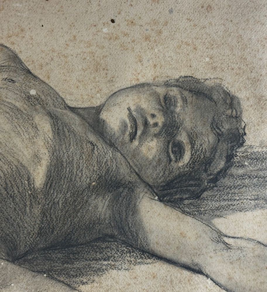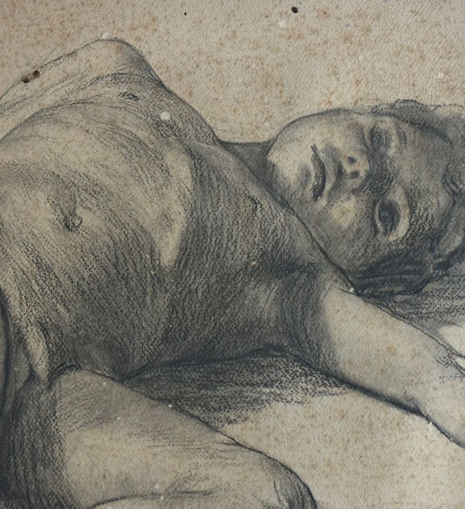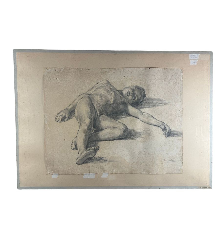 Drawing on paper, 19th century Italian school, depicting a Reclining Child. Drawing dimensions: 70x54 cm. Signed at the bottom right by an unidentified artist. The artwork shows slight signs of wear, with small tears in the lower part of the drawing.