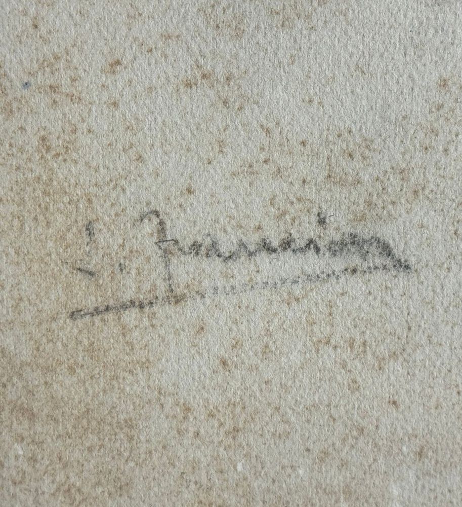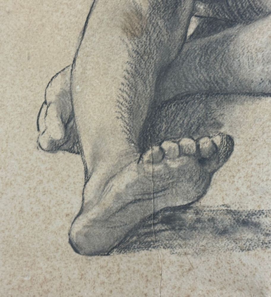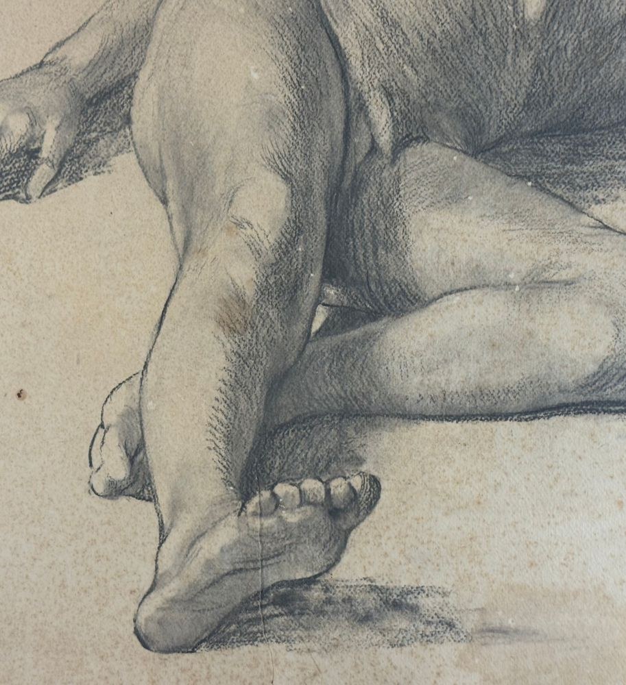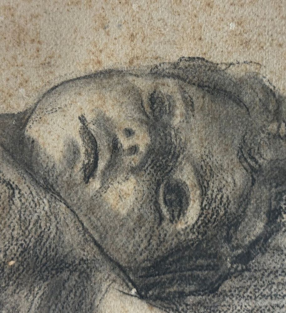 Drawing on paper, 19th century Italian school, depicting a Reclining Child. Drawing dimensions: 70x54 cm. Signed at the bottom right by an unidentified artist. The artwork shows slight signs of wear, with small tears in the lower part of the drawing.