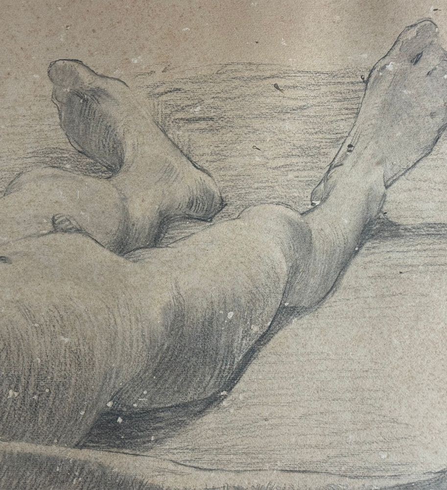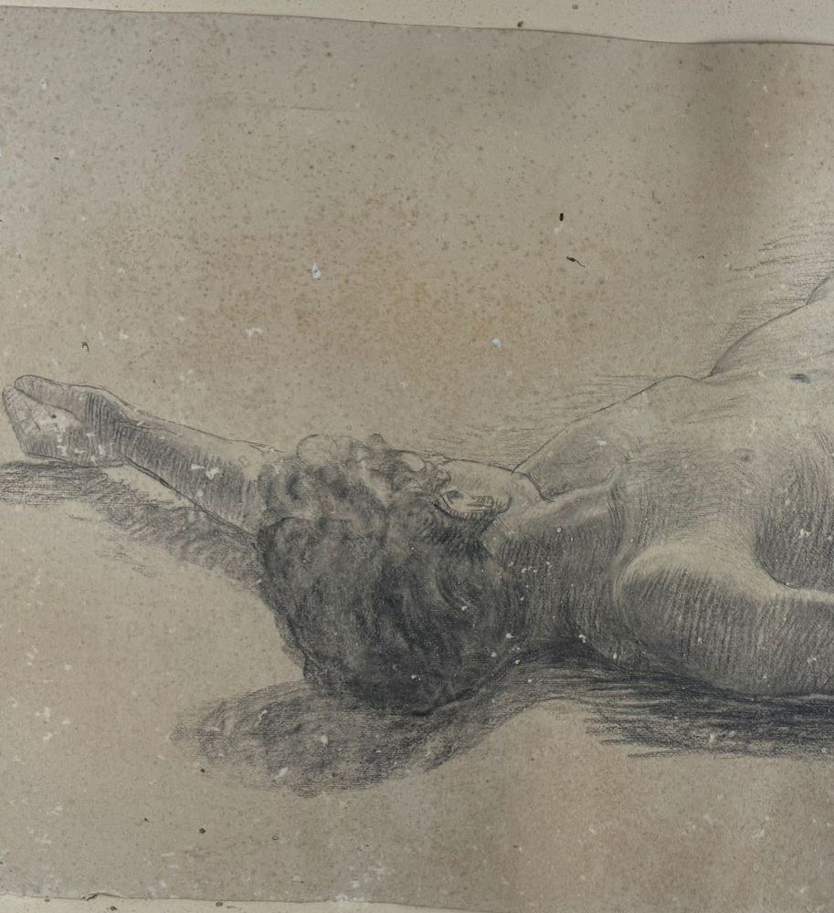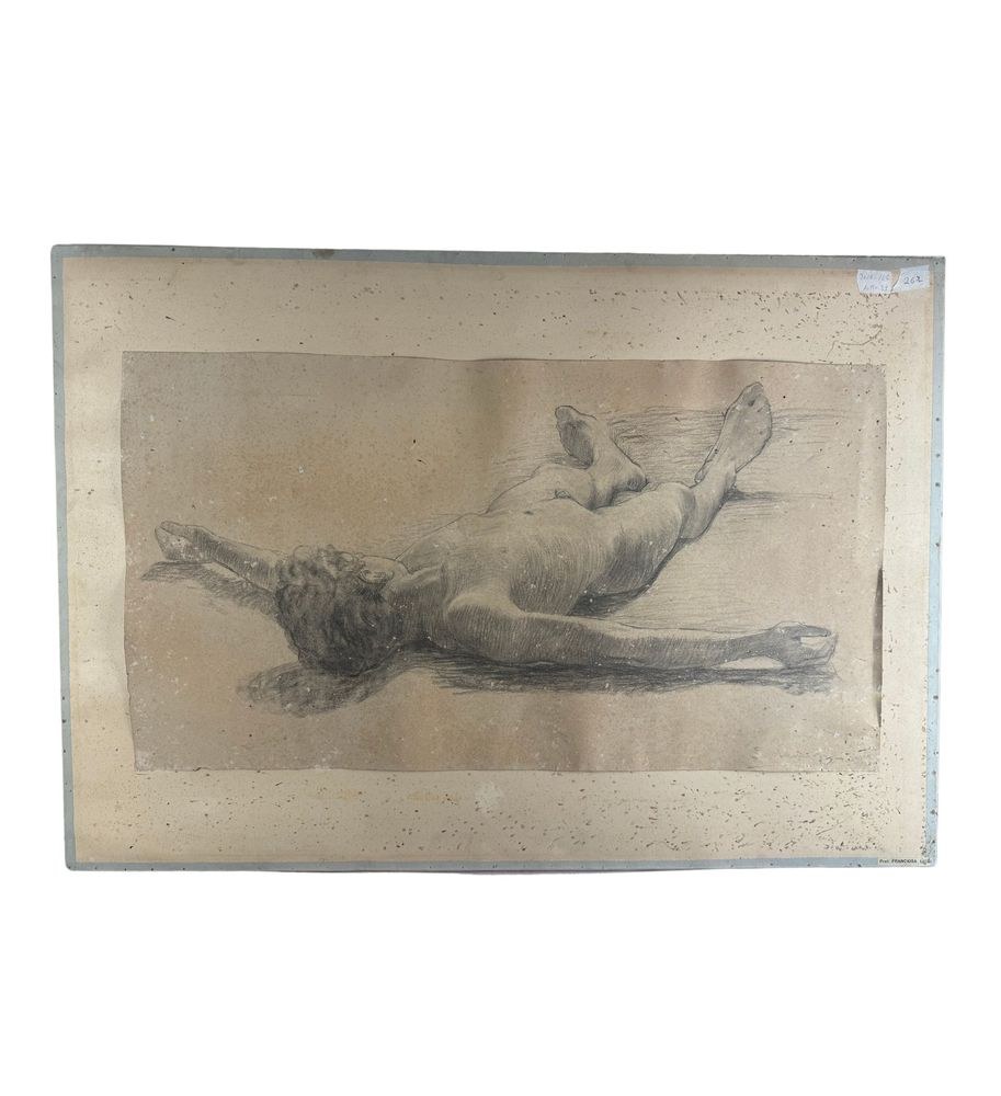 Drawing on paper, 19th century Italian school, depicting a Reclining Child. Drawing dimensions: 47x87 cm. Signed at the bottom right by an unidentified artist. The artwork shows slight signs of wear.