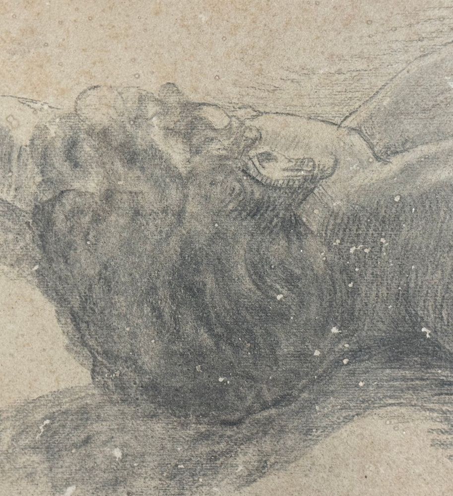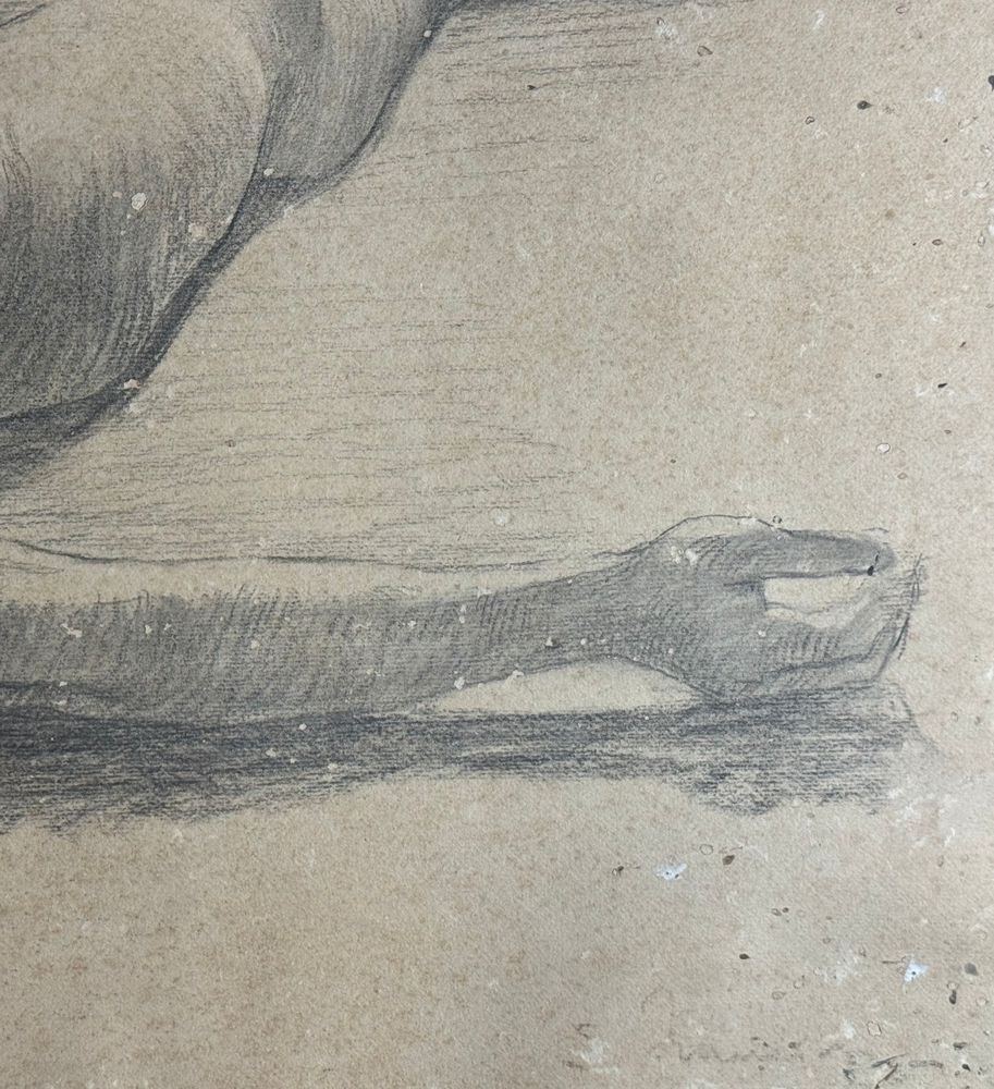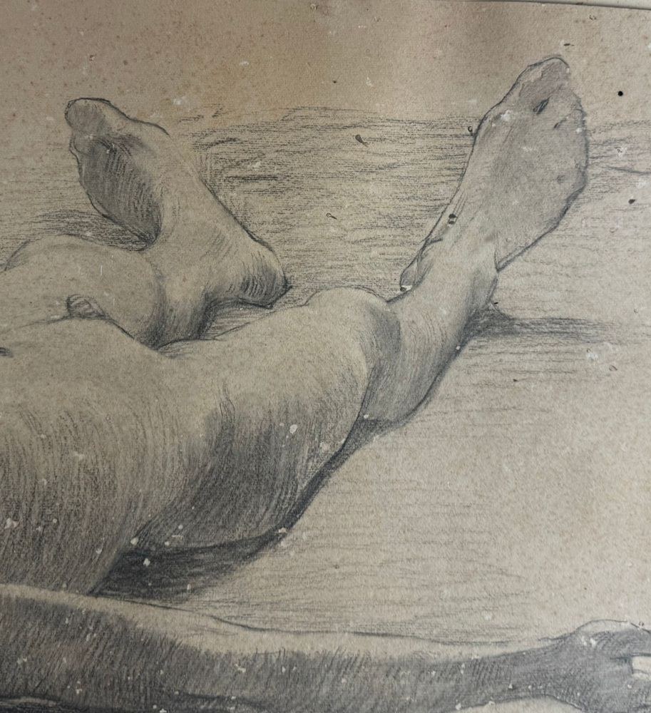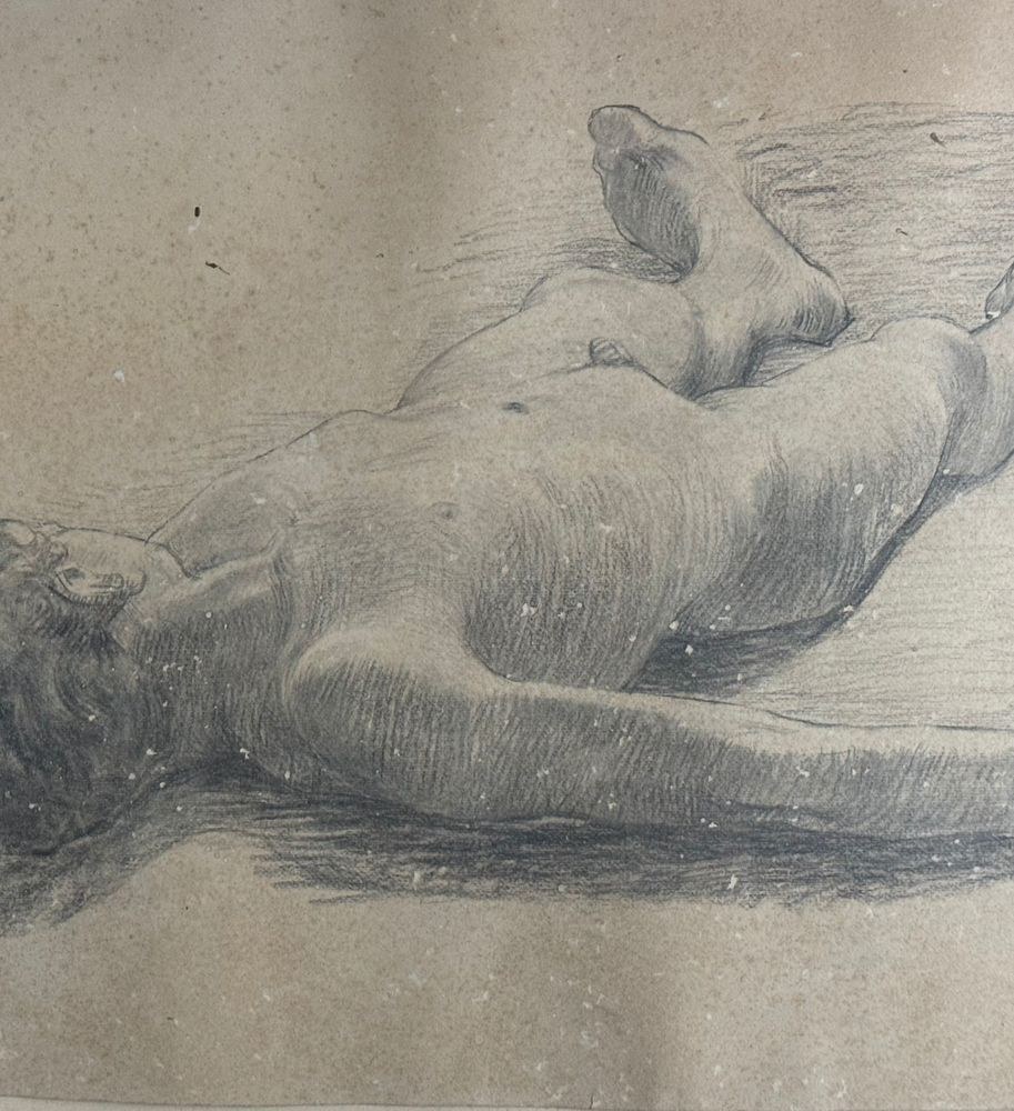 Drawing on paper, 19th century Italian school, depicting a Reclining Child. Drawing dimensions: 47x87 cm. Signed at the bottom right by an unidentified artist. The artwork shows slight signs of wear.