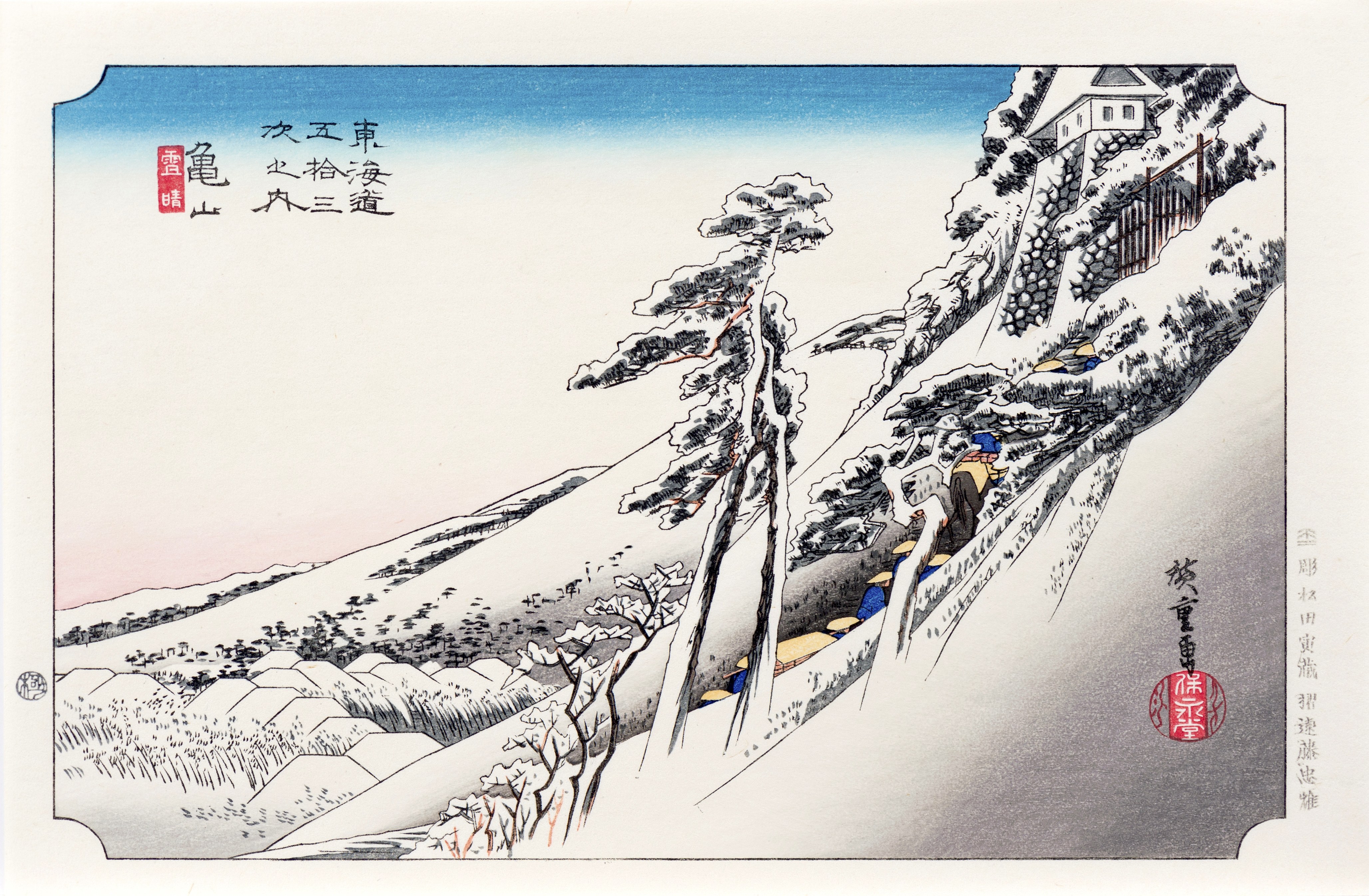 Kameyama i Kanbara to jedyne śnieżne sceny z serii i obie zasługują na szczególną uwagę. Kanbara pokazana jest nocą, w czasie śnieżycy, podczas gdy Kameyama ukazuje jasny, pogodny dzień po opadach śniegu. Widzimy tu procesję ludzi wolną pnącą się stromą ścieżką ku górze. Niebieskie płaszcze i żółte czapki wędrowców prześwitują przez ośnieżone drzewa. Na szczycie zbocza góruje wieża zamku Kameyama. Drewniane ogrodzenie obok kamiennego muru to brama Kyo-guchi prowadząca do stacji Kameyama. Niebieskie cieniowanie wzdłuż górnej krawędzi grafiki i różowe na horyzoncie tworzą uderzający kontrast z ośnieżonym, monochromatycznym krajobrazem.