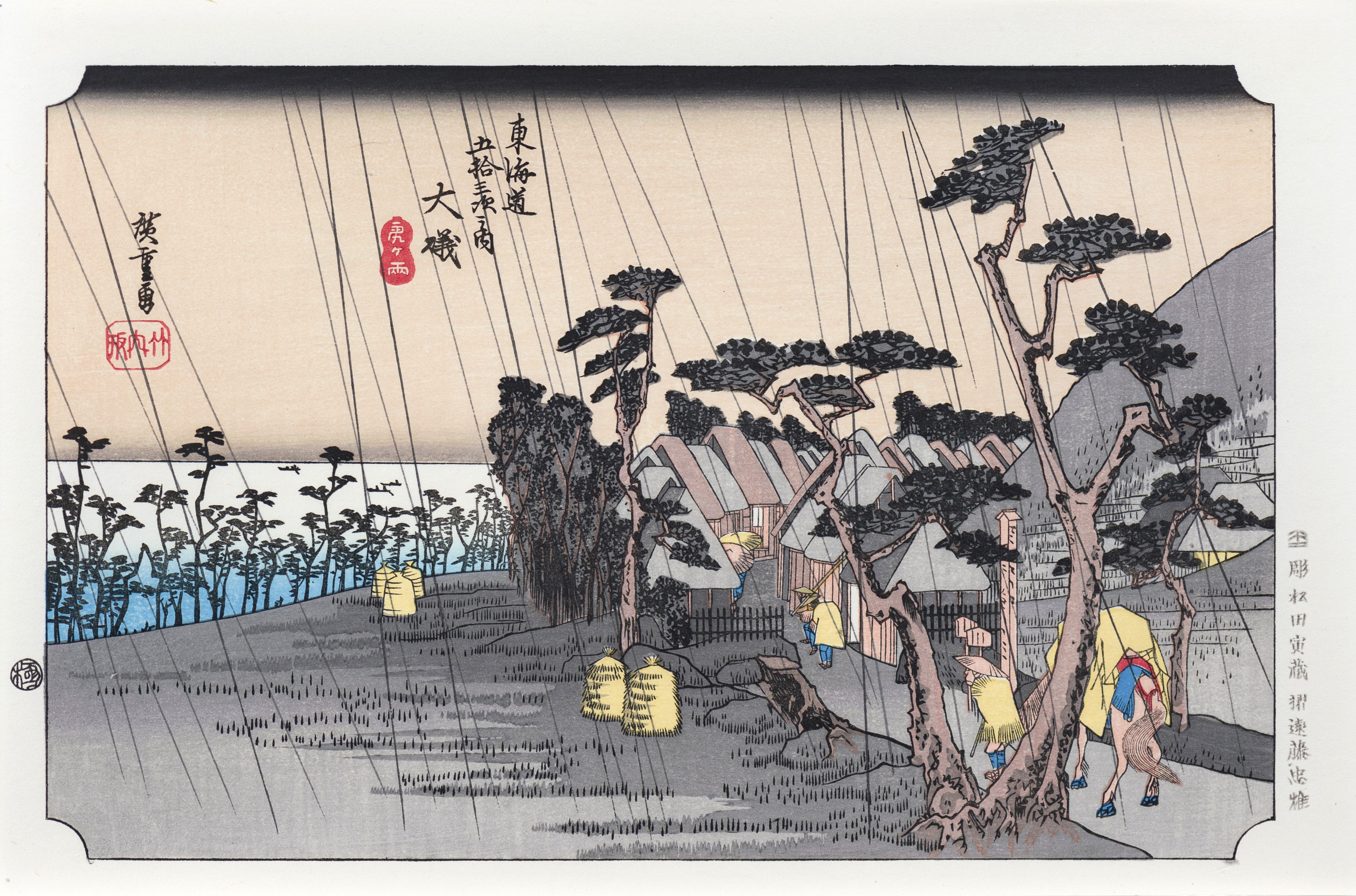 W 1832 roku Hiroshige podróżował ze świtą urzędników szoguna z Edo (Tokio) do Kioto wzdłuż drogi Tokaido. Podróż ta była dla niego otwierającym oczy i zmieniającym życie doświadczeniem. Po podróży wrócił do Edo i rozpoczął prace nad serią drzeworytów na podstawie szkiców, które wykonał. Opublikowana w latach 1833-1834 seria „Pięćdziesiąt trzy stacje Tokaido” (Hoeido Tokaido) przyniosła Hiroshige ogromne uznanie zarówno krytyków, jak i publiczności. Umiejętnie uchwycił nastrojowe i klimatyczne warunki pogodowe, oddając mgłę, deszcz, śnieg i wieczorne efekty świetlne. Poetyckie krajobrazy zrównoważył dodając postacie, które stanowią osobisty element tych prac. Seria oferuje widzom możliwość przeniesienia się w czasie do Japonii Hiroshige w cieniu szogunatu Tokugawa i zobaczenia tego życia tak, jak doświadczył go artysta. Seria stała się tak popularna, że ciągłe jej wznawianie w czasach Edo spowodowało całkowite zniszczenie matryc pierwszego wydania.
