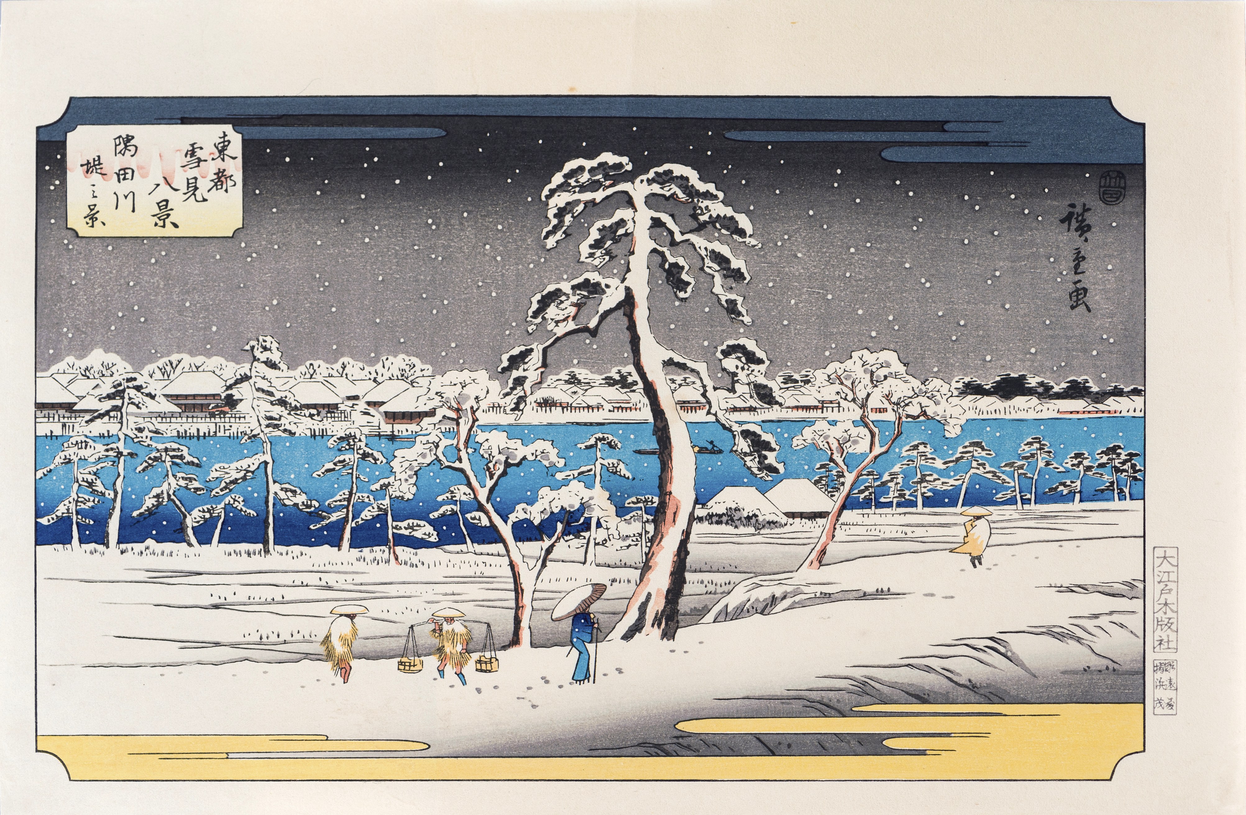 Zimowa scena przedstawiająca kilka osób spacerujących nocą wzdłuż nabrzeża rzeki Sumida. Śnieg delikatnie pada, a pokryte śniegiem sosny otaczają ciemnoniebieską wodę. Piękny, spokojny projekt z delikatnym cieniowaniem wody i nieba.