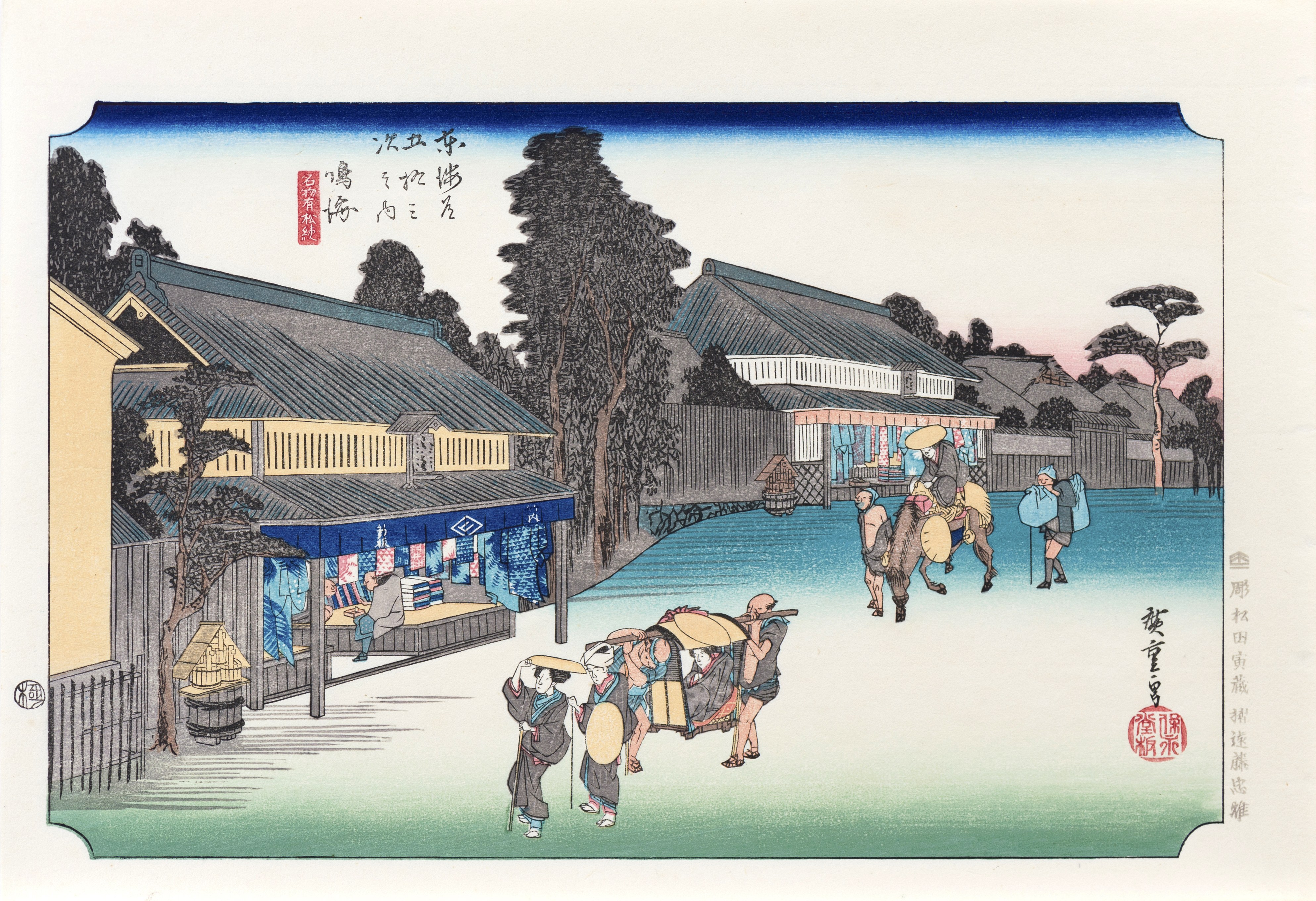 W 1832 roku Hiroshige podróżował ze świtą urzędników szoguna z Edo (Tokio) do Kioto wzdłuż drogi Tokaido. Podróż ta była dla niego otwierającym oczy i zmieniającym życie doświadczeniem. Po podróży wrócił do Edo i rozpoczął prace nad serią drzeworytów na podstawie szkiców, które wykonał. Opublikowana w latach 1833-1834 seria „Pięćdziesiąt trzy stacje Tokaido” (Hoeido Tokaido) przyniosła Hiroshige ogromne uznanie zarówno krytyków, jak i publiczności. Umiejętnie uchwycił nastrojowe i klimatyczne warunki pogodowe, oddając mgłę, deszcz, śnieg i wieczorne efekty świetlne. Poetyckie krajobrazy zrównoważył dodając postacie, które stanowią osobisty element tych prac. Seria oferuje widzom możliwość przeniesienia się w czasie do Japonii Hiroshige w cieniu szogunatu Tokugawa i zobaczenia tego życia tak, jak doświadczył go artysta. Seria stała się tak popularna, że ciągłe jej wznawianie w czasach Edo spowodowało całkowite zniszczenie matryc pierwszego wydania.