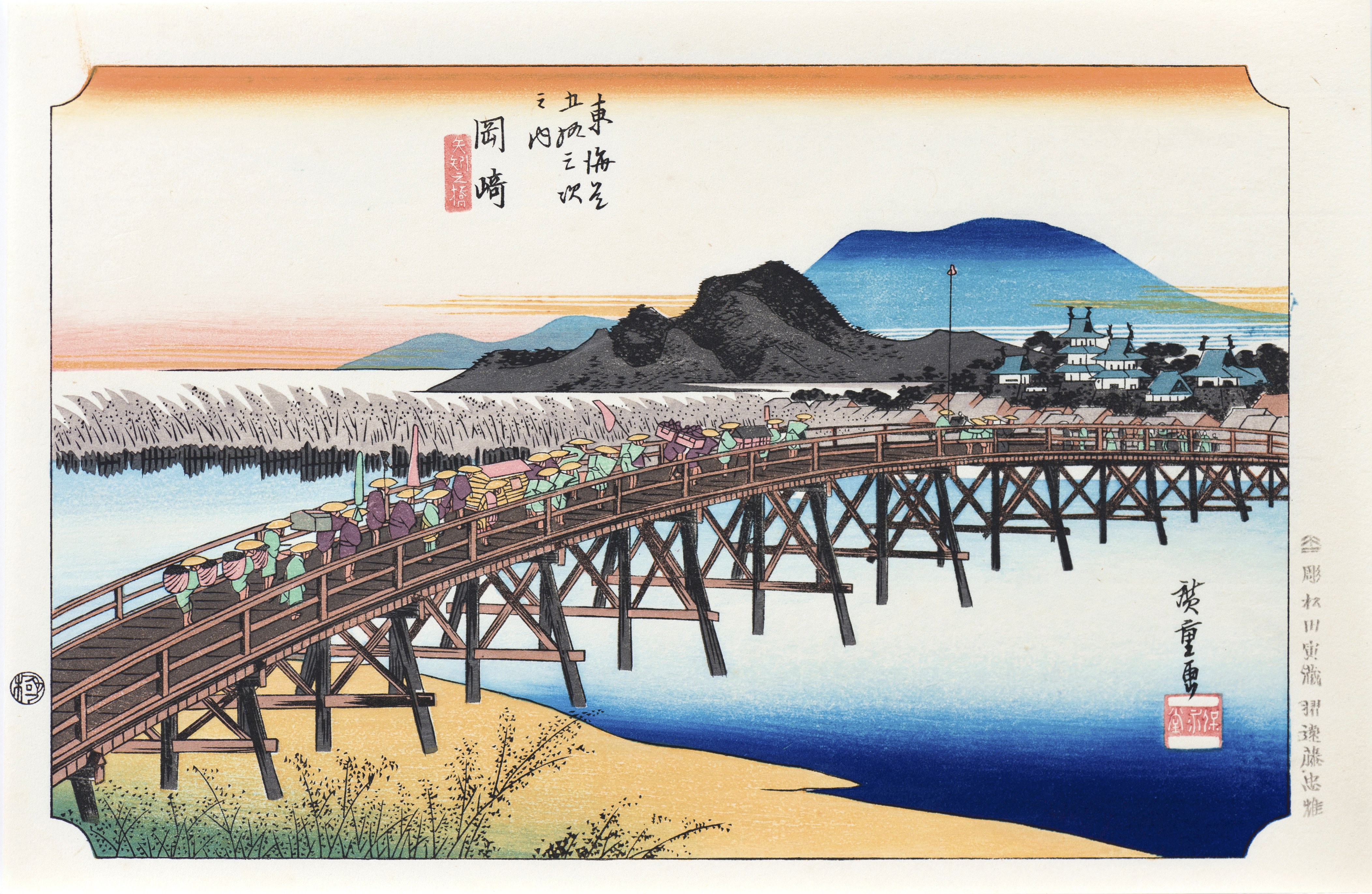 Okazaki, które było miejscem urodzenia Ieyasu, pierwszego szoguna z rodu Tokugawa, stało się jednym z największych miast tamtych czasów. W epoce Edo budowa mostów była ściśle kontrolowana przez rząd w celu ochrony Edo przed atakami, a podróżni byli zmuszeni przekraczać rzeki łodziami. Most Yahagi był jednak wyjątkowy, bo powstał na zlecenie samego szoguna. Most Yahagi w tamtych czasach był najdłuższym mostem na szlaku Tokaido. Na obrazie procesja daimyo przemierza most od jednego końca do drugiego. Za mostem widać zamek Okazaki i wiele domów. Rzeka i odległe góry zostały przedstawione w pięknych odcieniach błękitu przy użyciu bokashi.