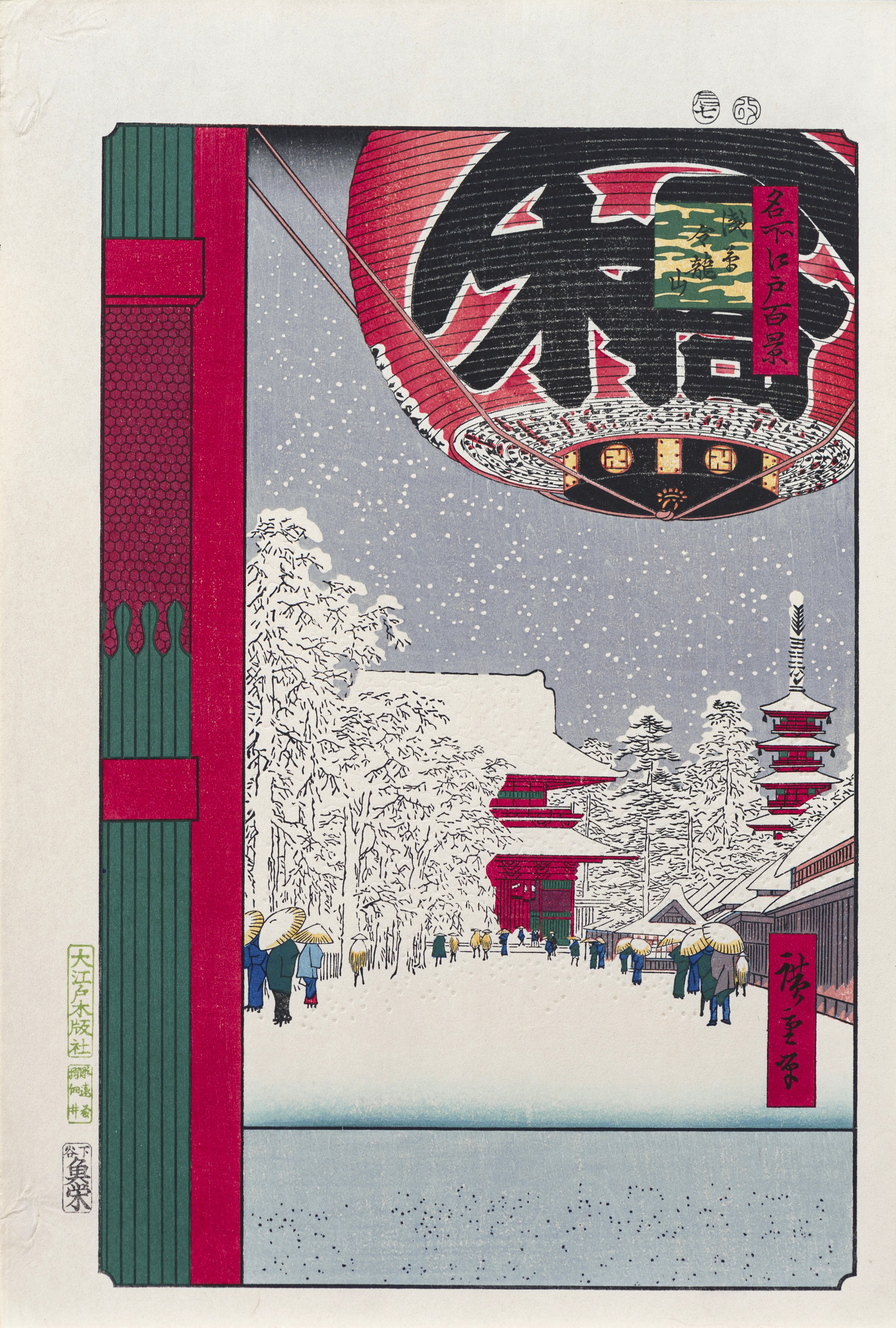 Świątynia Kinryūzan w dzielnicy Asakusa (scena zimowa). Drzeworyt miał upamiętniać odbudowę pagody świątyni po zniszczeniach doznanych podczas trzęsienia ziemi w 1855 r.