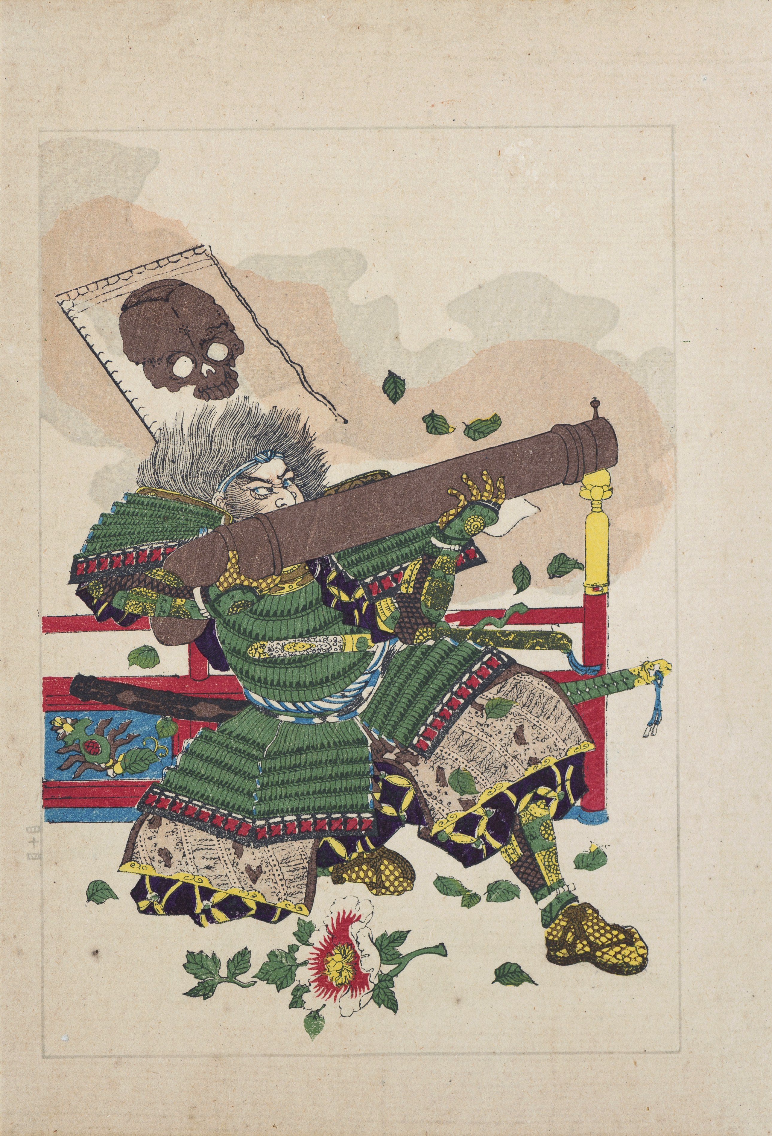 Inaue Daikyuro Masatada, przedstawiony w zbroi, bez hełmu, z chorągwią sashimono zdobioną trupią czaszką, z lufą armatnią i kwiatem peonii u stóp. Był sługą Kato Kiyomasa i nieustraszonym wojownikiem.