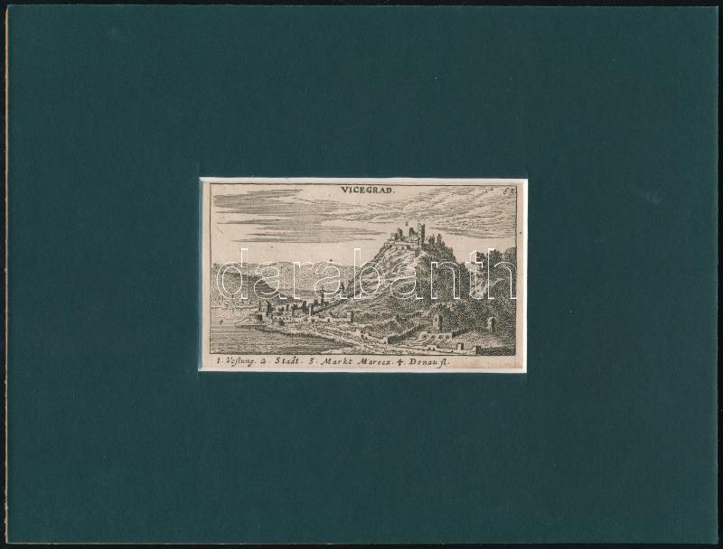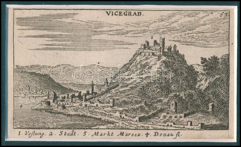 Visegrád és Nagymaros 1664-es rézmetszetű látképe. 7.5 x 13.5 cm Megjelent: (Nürnbergben) Sigmund von Birken: Der Donau Strand... című művében.