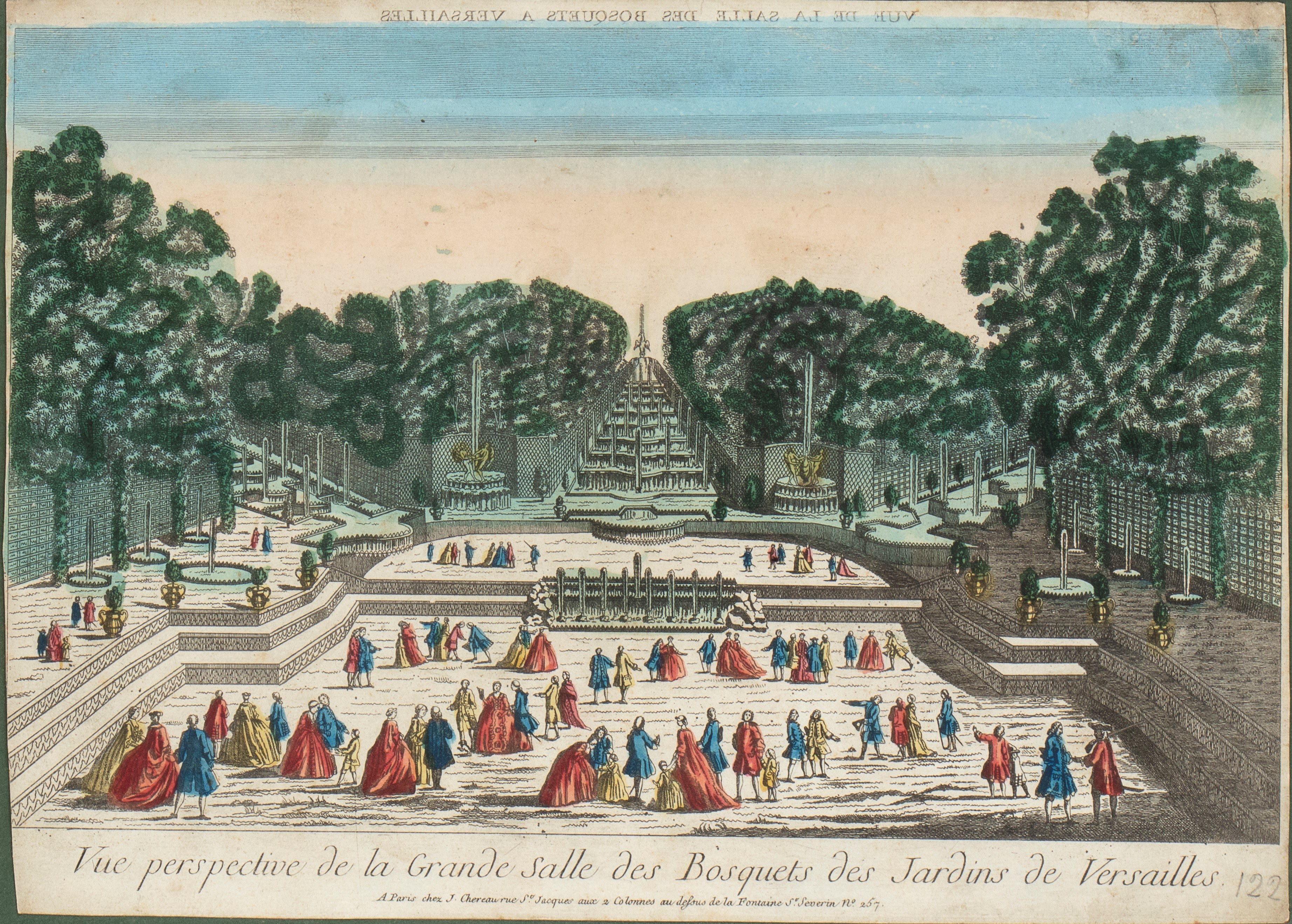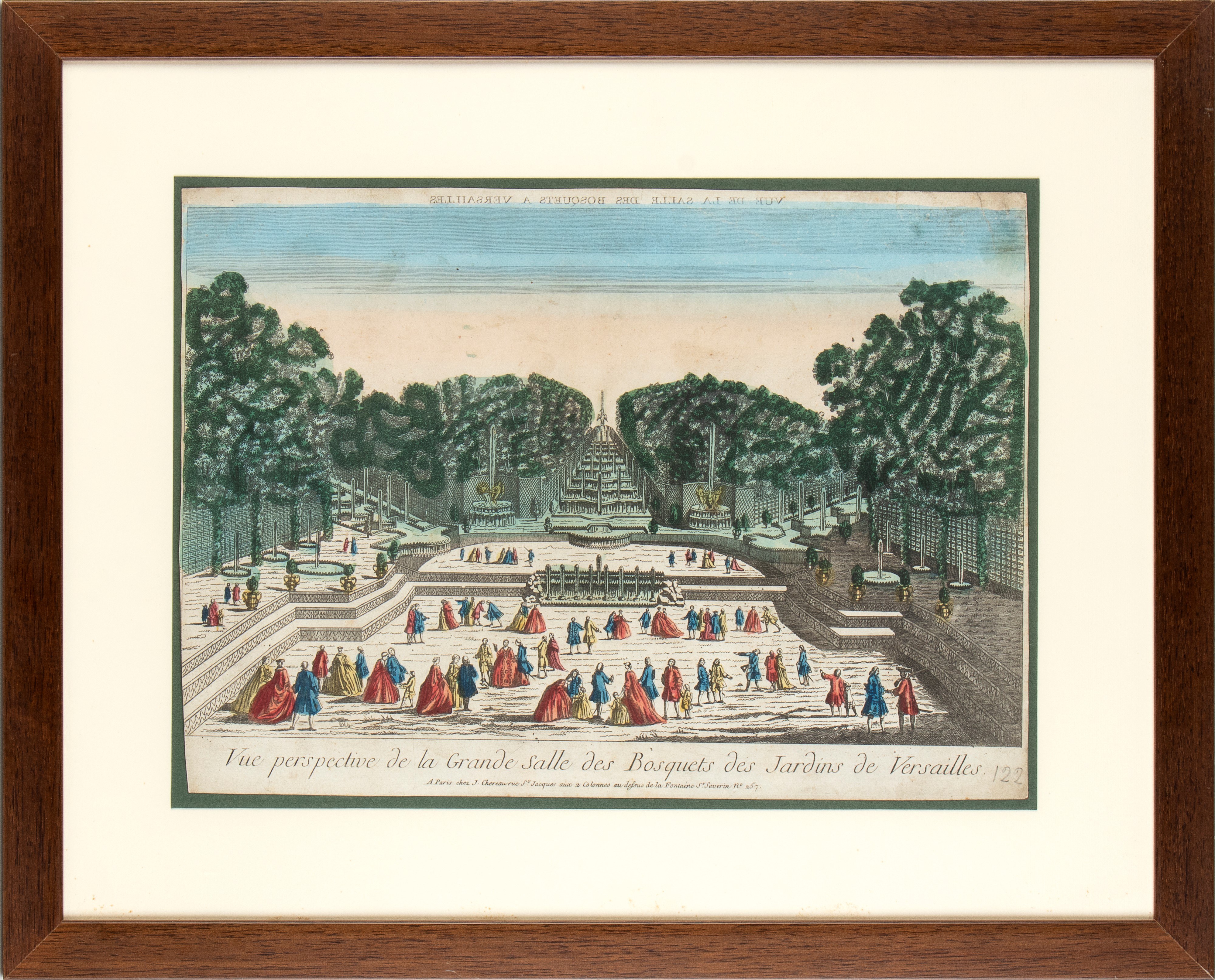 Etching and engraving, approx. 300 x 418 mm. Optical view, vue optique, of the gardens of Versailles, with the address of Jacques Chéreau at Rue Saint-Jacques aux 2 Colonnes.