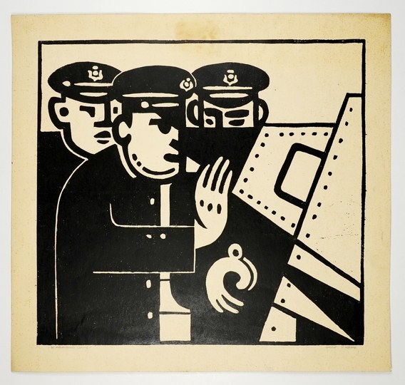 Linoryt form. 45x48,5 na ark. 53x56,2 cm. Pod kompozycją ołówkowe sygnatury: "W marynarskiej szkole", "Linoryt" i "St. Wałach". Na odwrocie naklejka wystawowa CBWA w Krakowie. Niewielkie zaplamienie górnej części arkusza (spowodowane zapewne klejem).