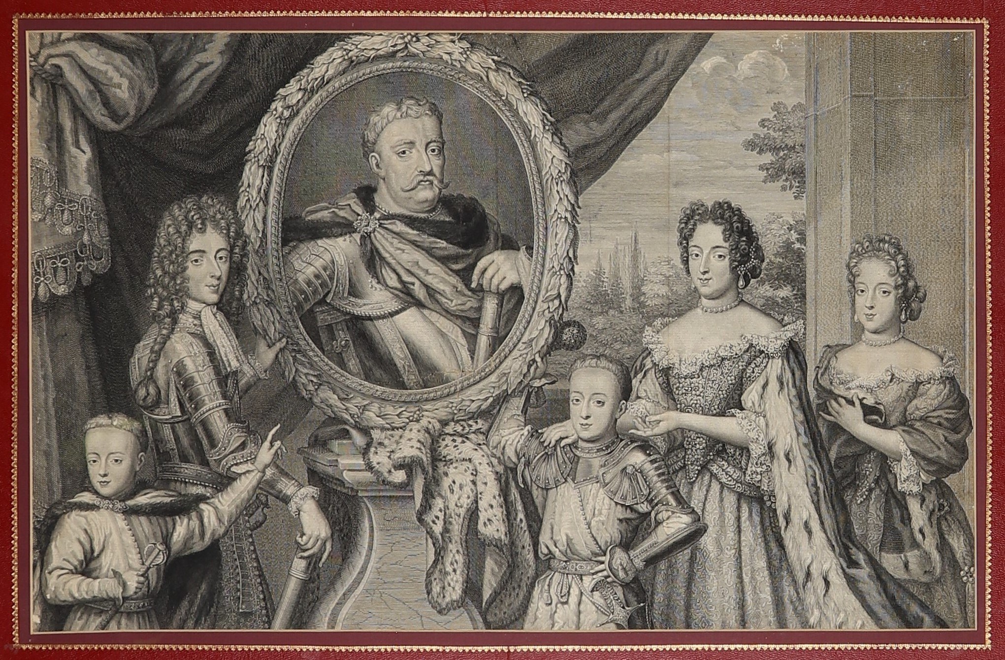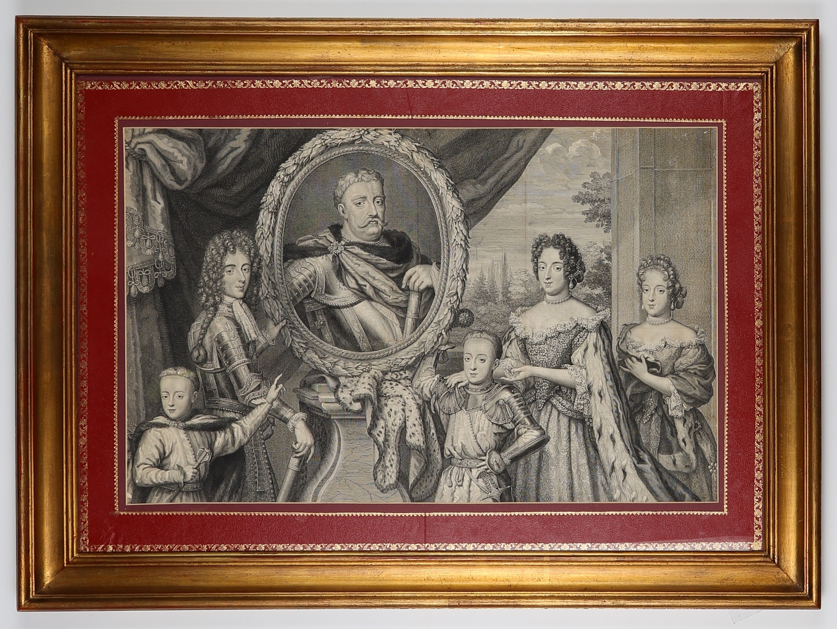 WILANÓW, JAN III SOBIESKI (1629–1696, król Polski od 1674 i wielki książę litewski w latach 1674–1696). Portret rodzinny władcy z żoną i dziećmi: Sobieski widoczny jako król na portrecie w owalnej ramie, podtrzymywanej przez królewiczów Jakuba Ludwika i Aleksandra Benedykta; w lewym rogu Konstanty Władysław, z prawej strony Maria Kazimiera z Teresą Kunegundą; rycina sporządzona na podstawie obrazu olejnego z 1691 r., autorstwa H. Gascara (Gascarda, 1634 lub 1635–1701), znajdującego się w Państwowych Zbiorach Sztuki na Wawelu w Krakowie w 1691 r.; wierna i stojąca na wysokim poziomie artystycznym graficzna kopia tego obrazu, została sporządzona w 1693 r. w Rzymie przez B. Farjata (1646–1720); miedz. cz.-b., złocona rama, passe-partout z tłoczono-złoconymi wzorami; wym. w świetle passe-partout 615x390 mm, wym. z ramą 825x610 mm; tyt. niewidoczny.