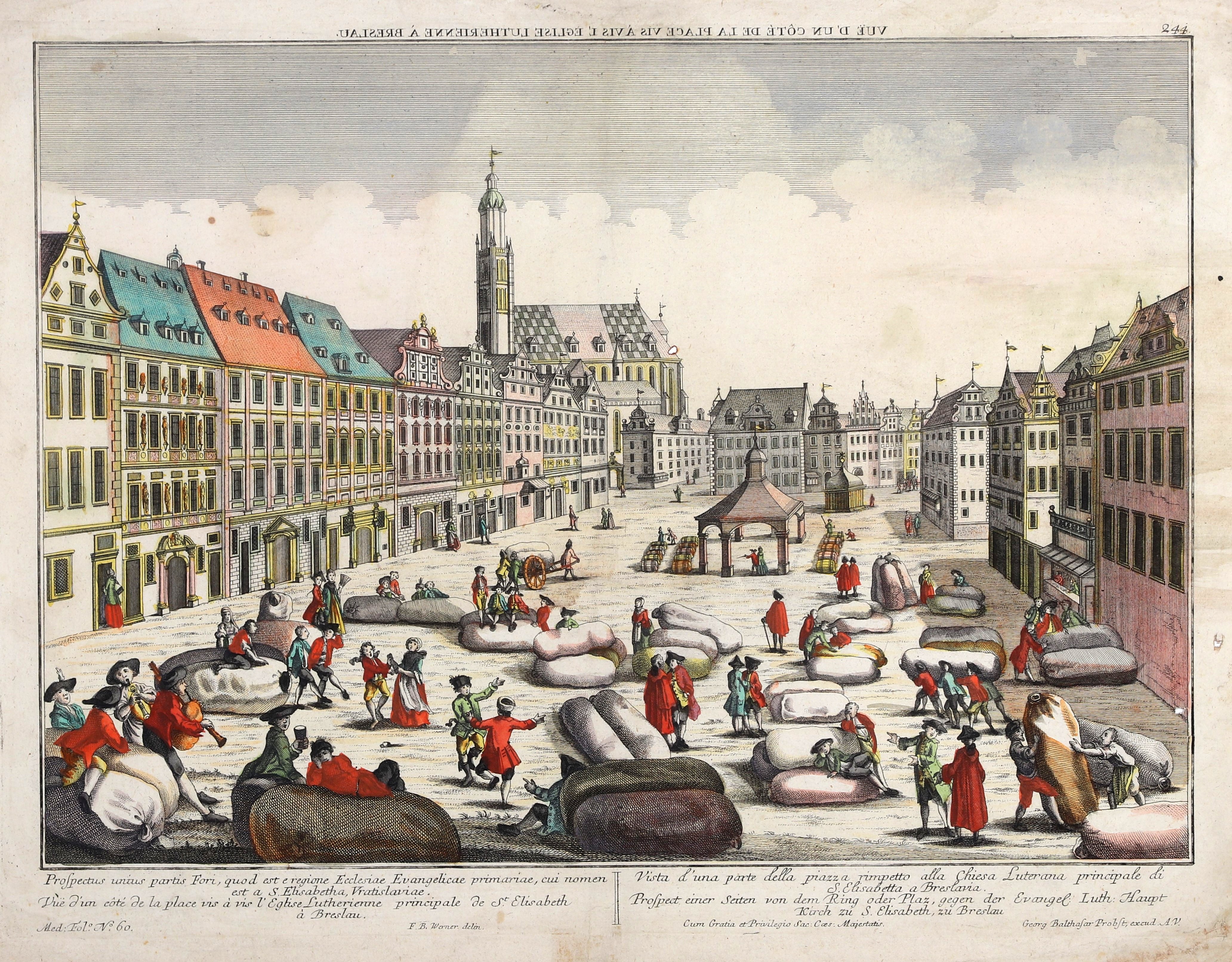 WROCŁAW. Rynek z kościołem św. Elżbiety; rys. F.B. Werner, wyd. G.B. Probst, ok. 1760; w dole czterojęzyczny opis: Prospectus unius partis Fori […]; widok z serii Guckkastenblatt – do oglądania w tzw. latarni magicznej; miedz. z akwf. kolor., st. db., zabrudzenia i zagniecenia marginesów, kilka niewielkich ubytków papieru, naddarcia; wym. płyty 440x327 mm; tyt. w lustrzanym odbiciu: VUË D’UN CÔTÉ DE LA PLACE VIS A VIS L’EGLISE LUTHERIENNE À BRESLAU.