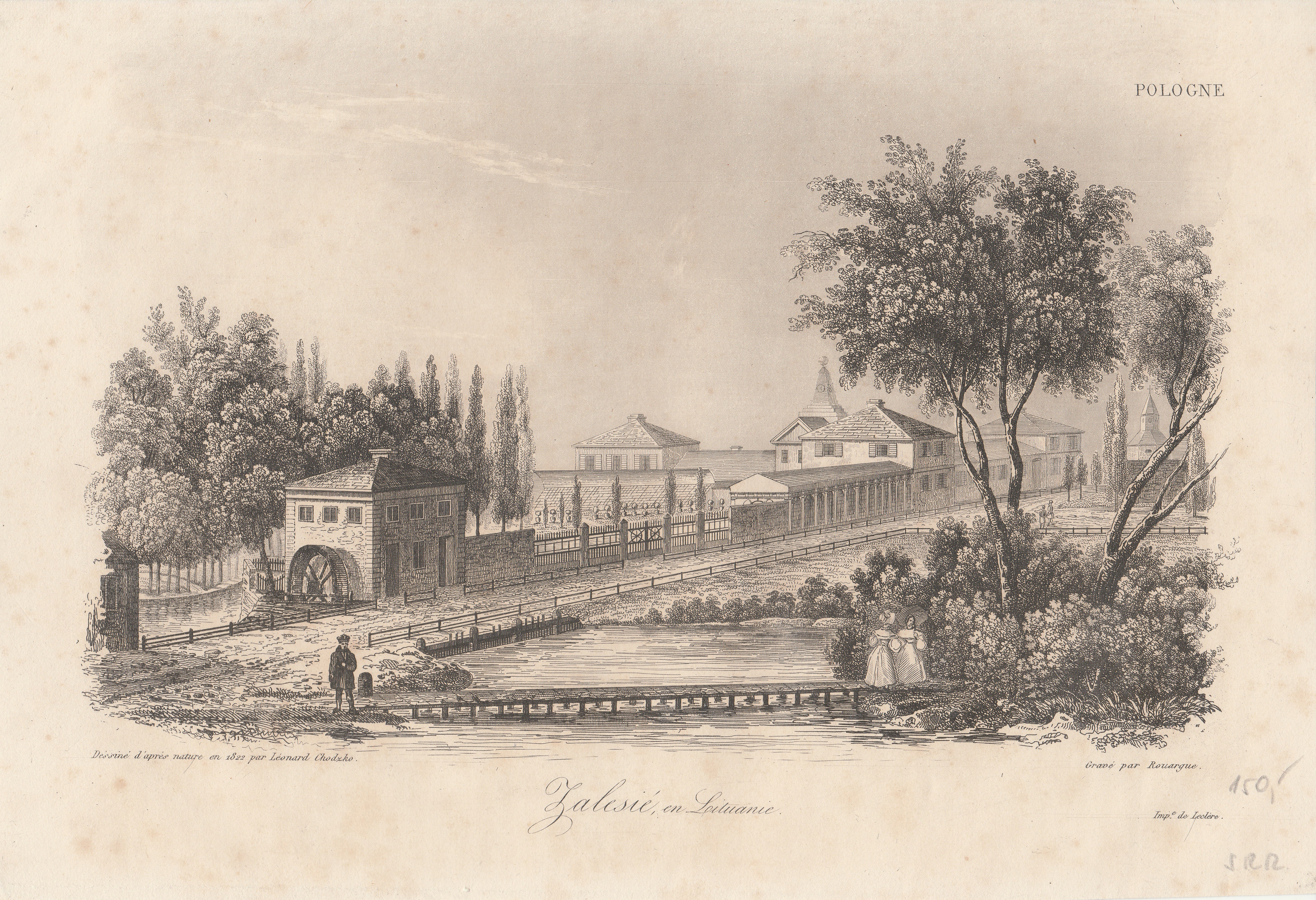 ZALESIE. Widok miejscowości, ryt. Rouargue (na dole sygn. Grave par Rouargue), druk. Leclere (sygn. na płycie Impr. de Leclere.), pochodzi z dzieła: La Pologne historique, littéraire, monumetale et pittoresque... autorstwa Leonarda Chodźko, wyd. Bureau Central, Paryż 1835-1842; stal. cz.-b., st. db.; wymiary arkusza: 245x170 mm; Zalesié, en Lituanie.