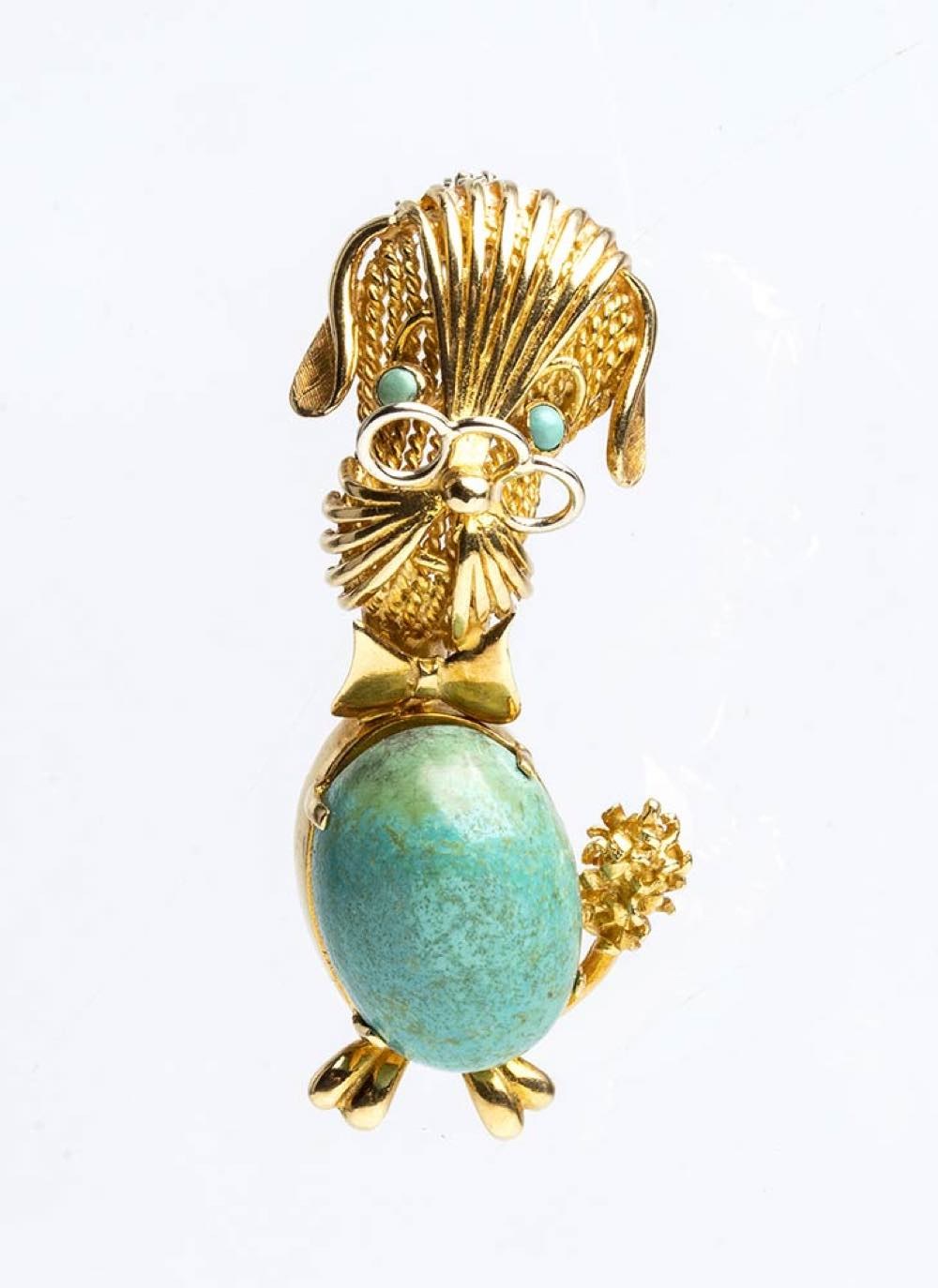 18k gold. Depicting a stylised dog, turquoise cabochon body. Hallmarked '750 - 1 AR - UNO AR'.