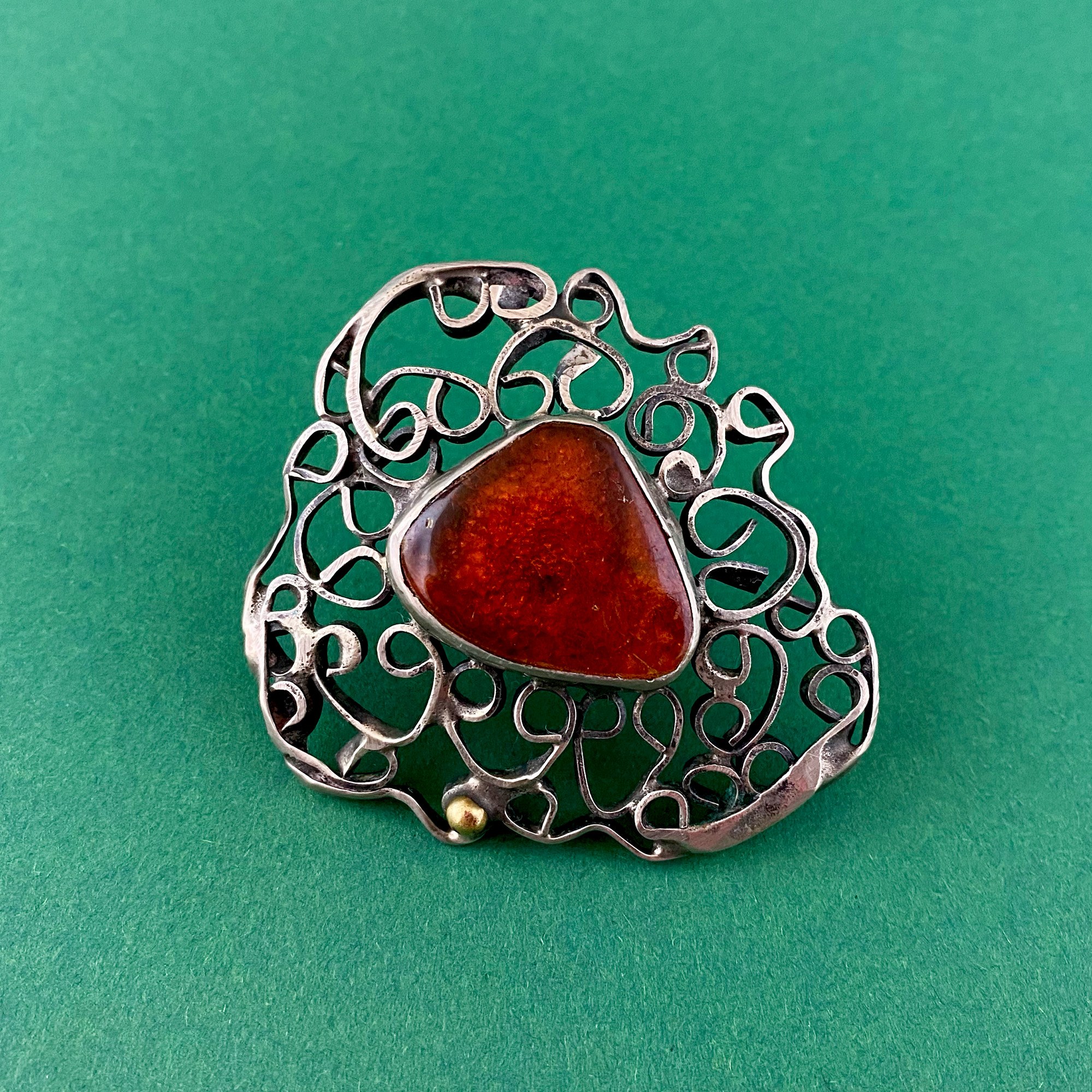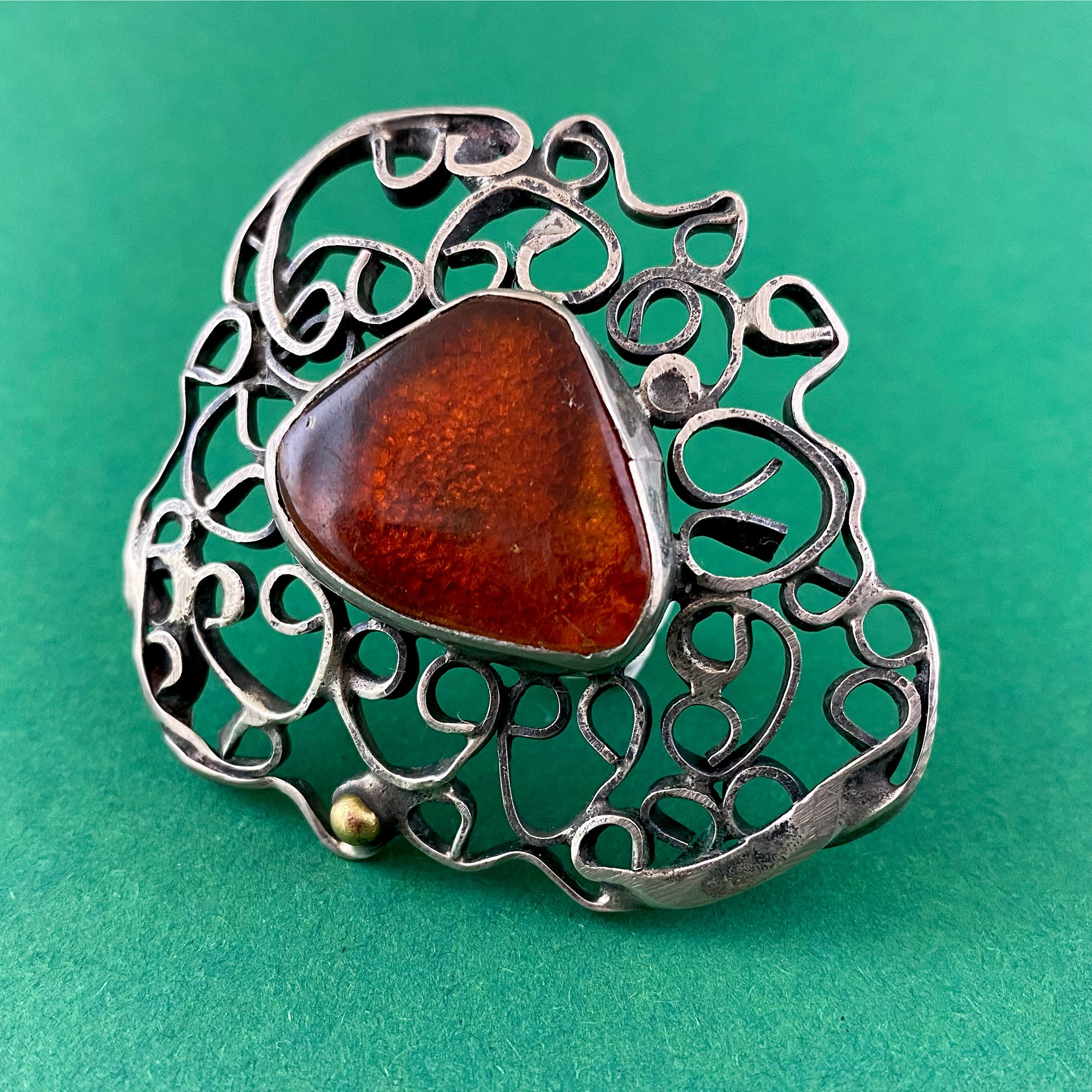 Ręcznie formowana brosza z białego metalu i kamienia ozdobnego (bursztyn?), brak oznaczeń. Wymiary: 6 x 5,5 cm