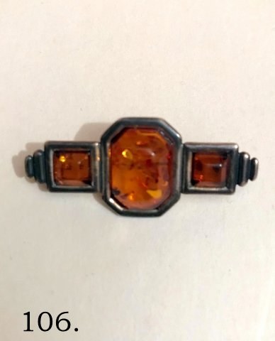 broszka srebrna z bursztynami w stylizacji Art Deco,dł.40,6mm,waga5,4g.