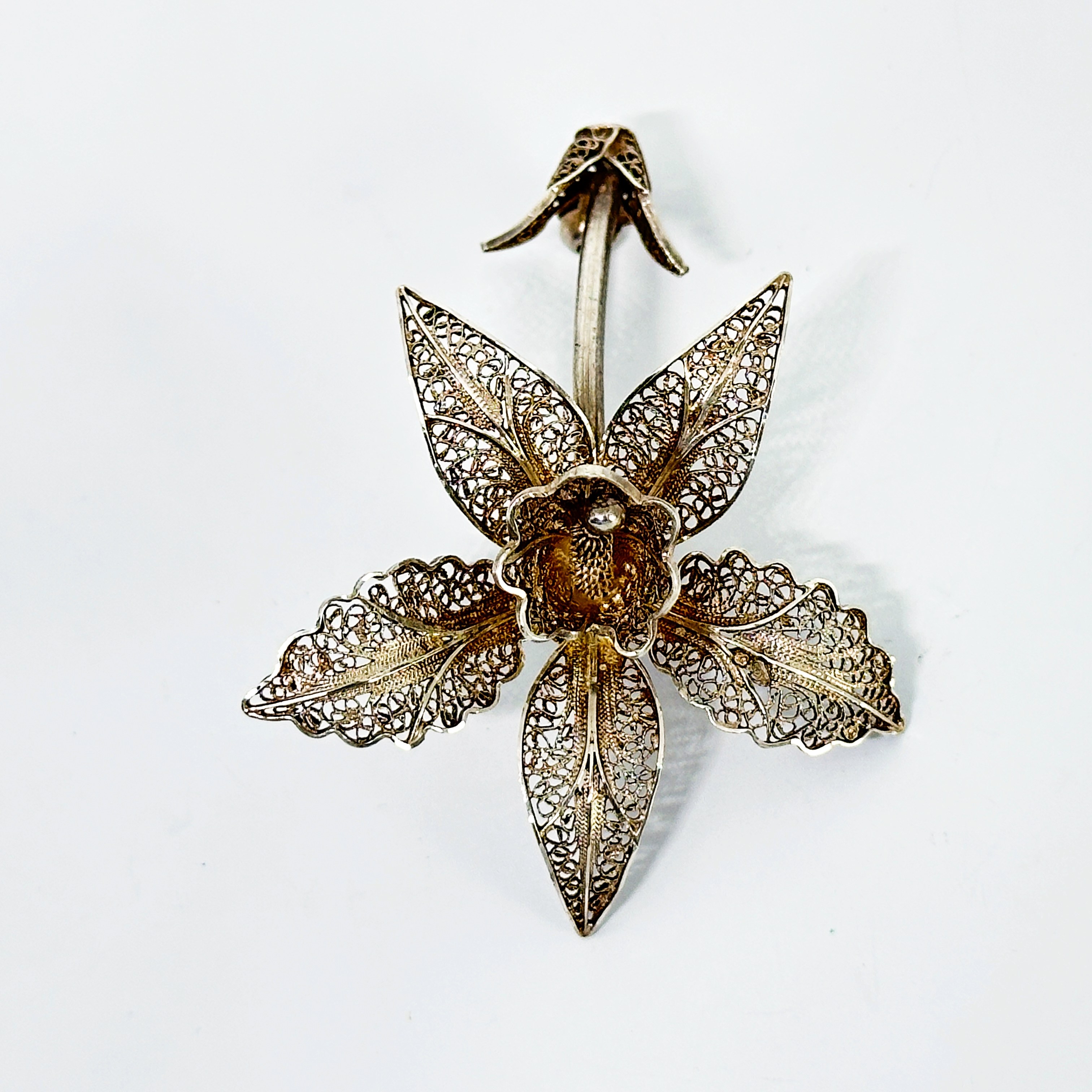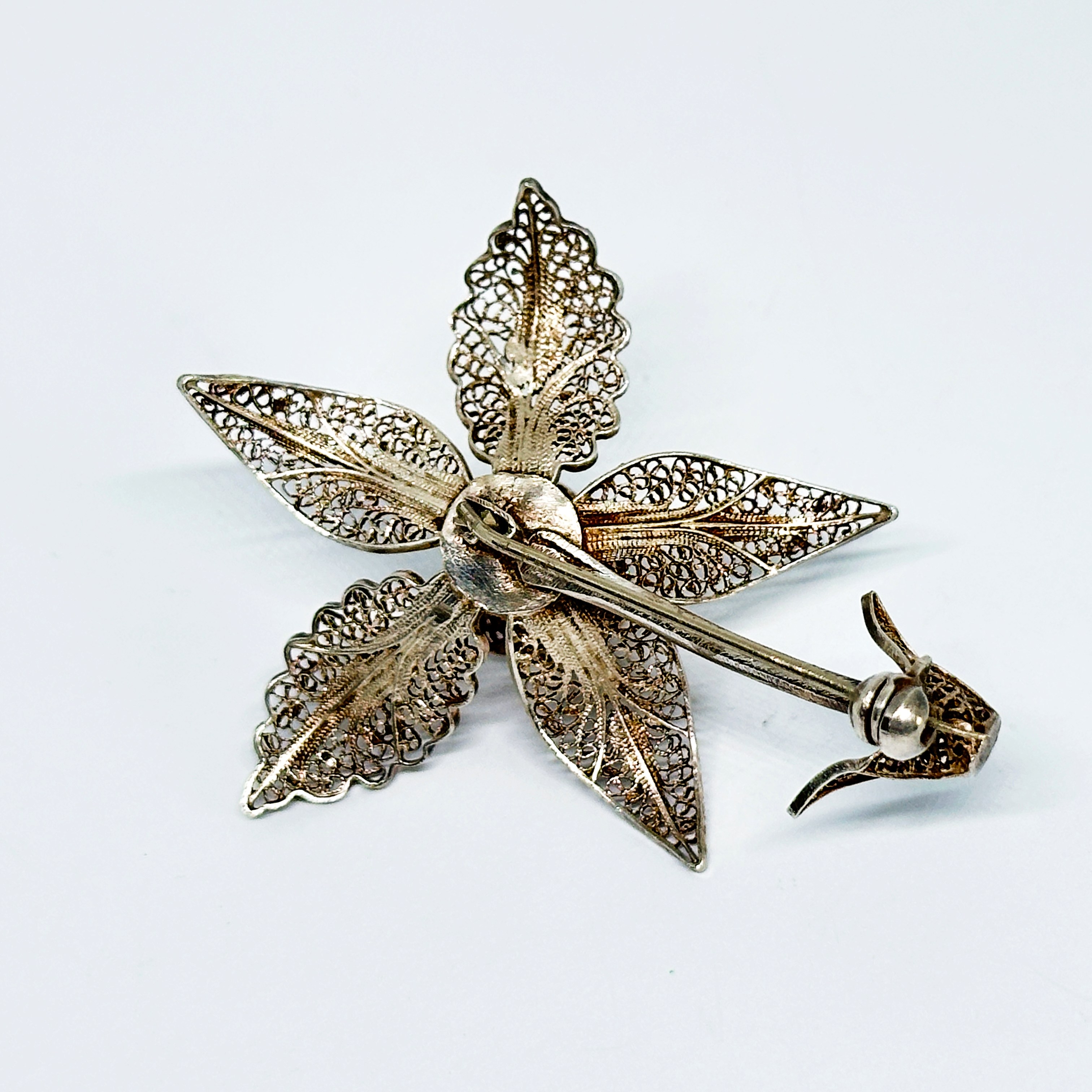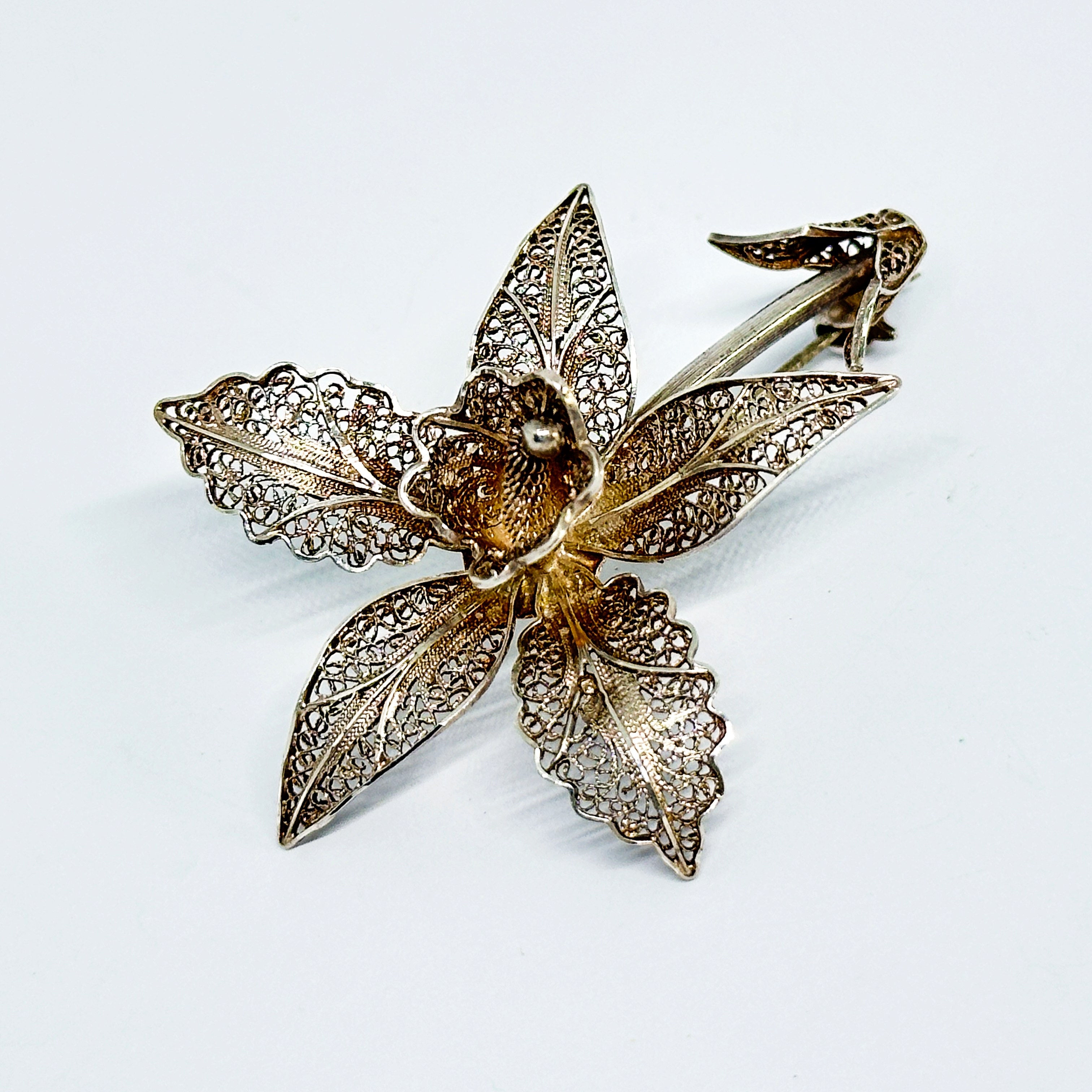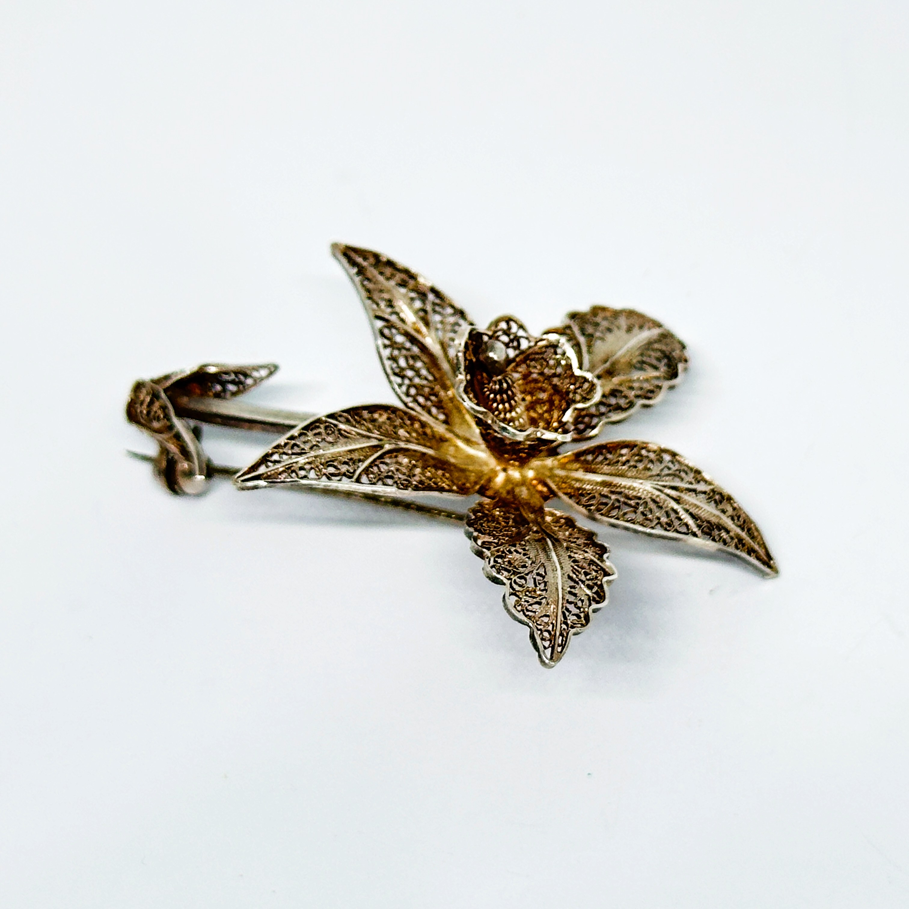 Srebrna ażurowa filigranowa broszka w formie kwiata