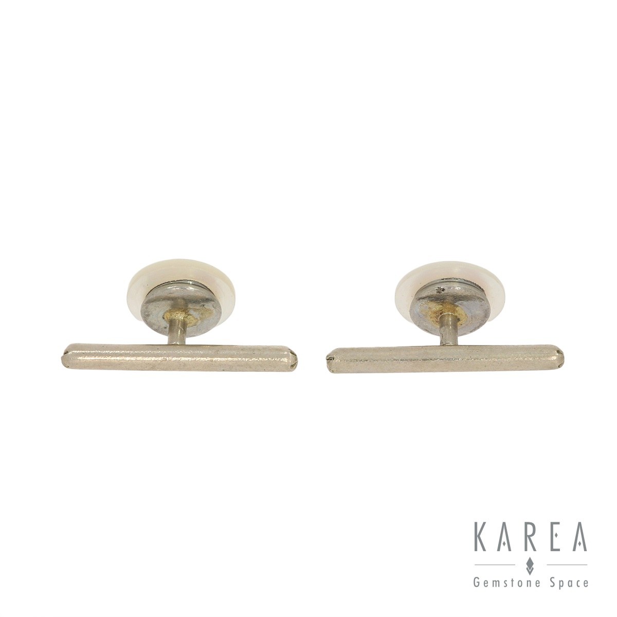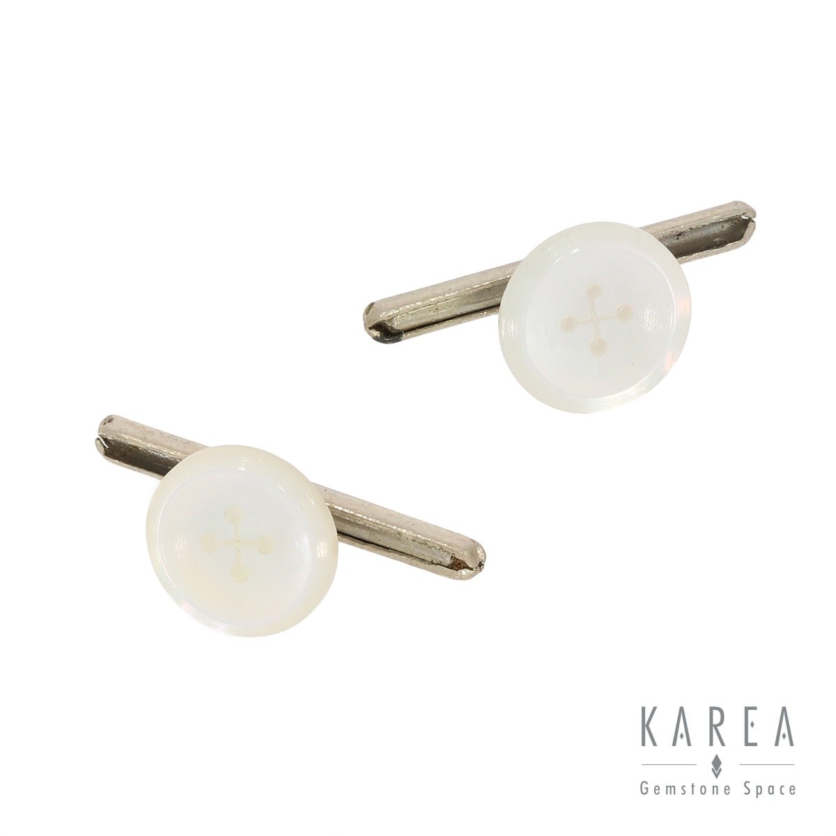 srebro brak pr., masa perłowa w formie guzika, grawerowana, średnica części ozdobnej: 1,1 cm, masa: 2,42 g