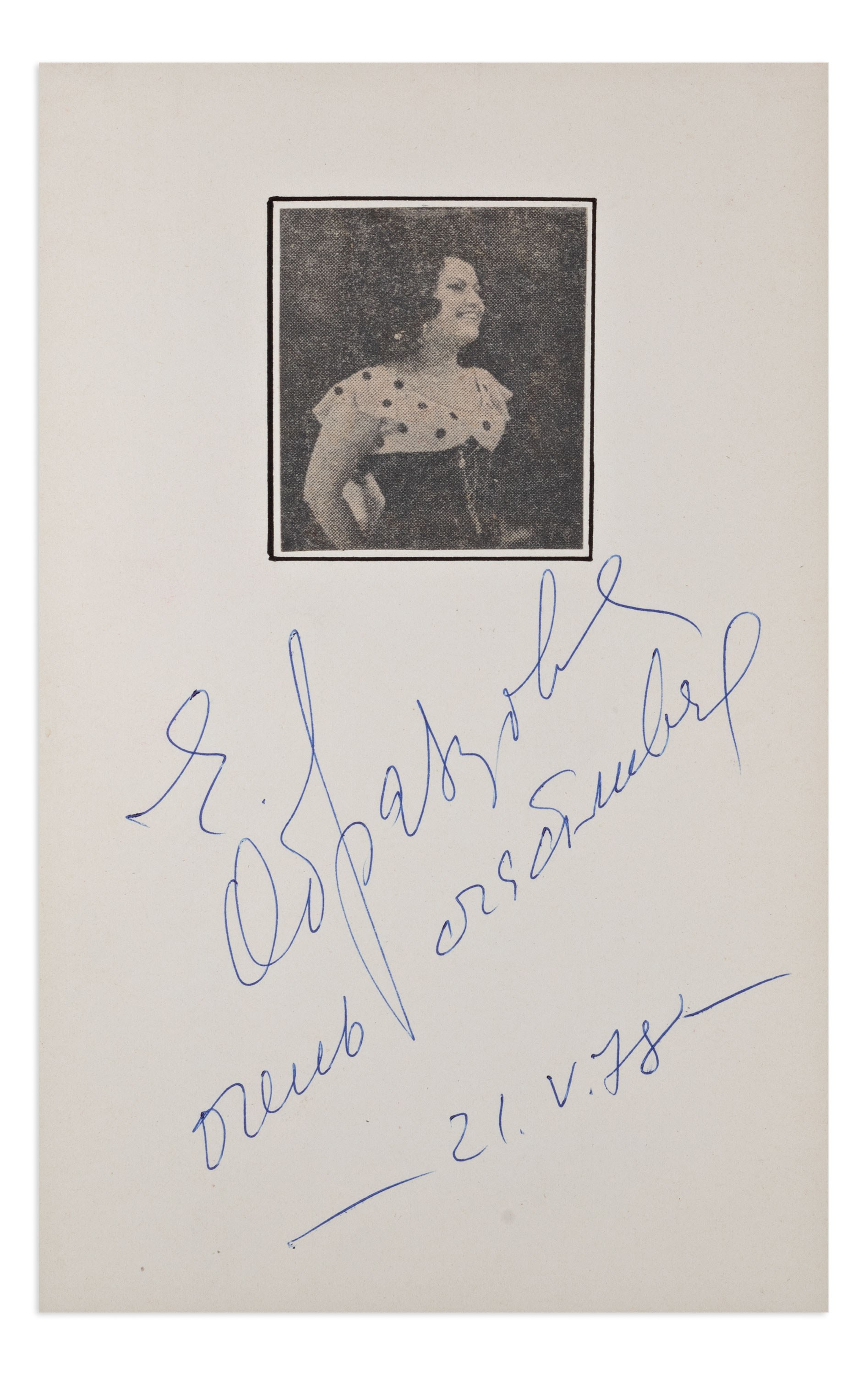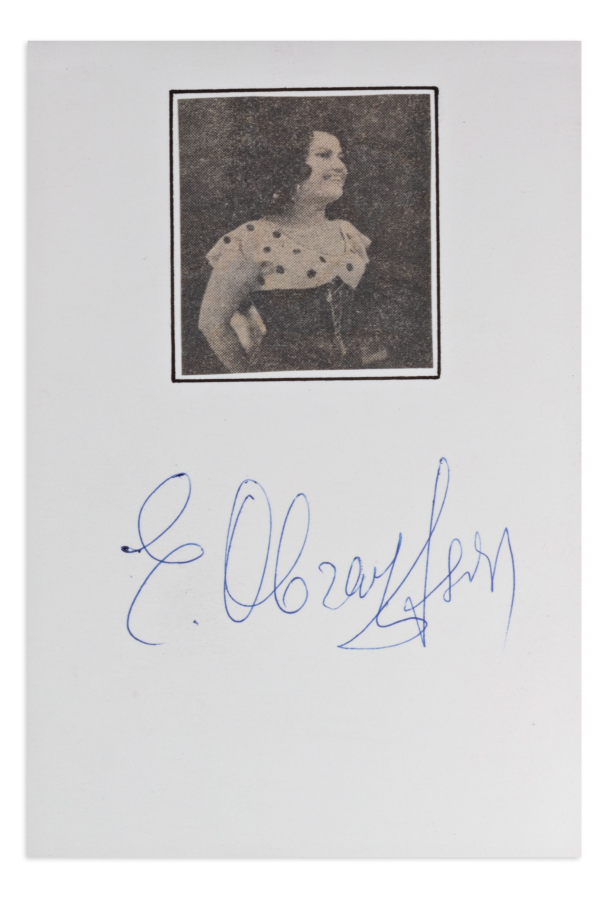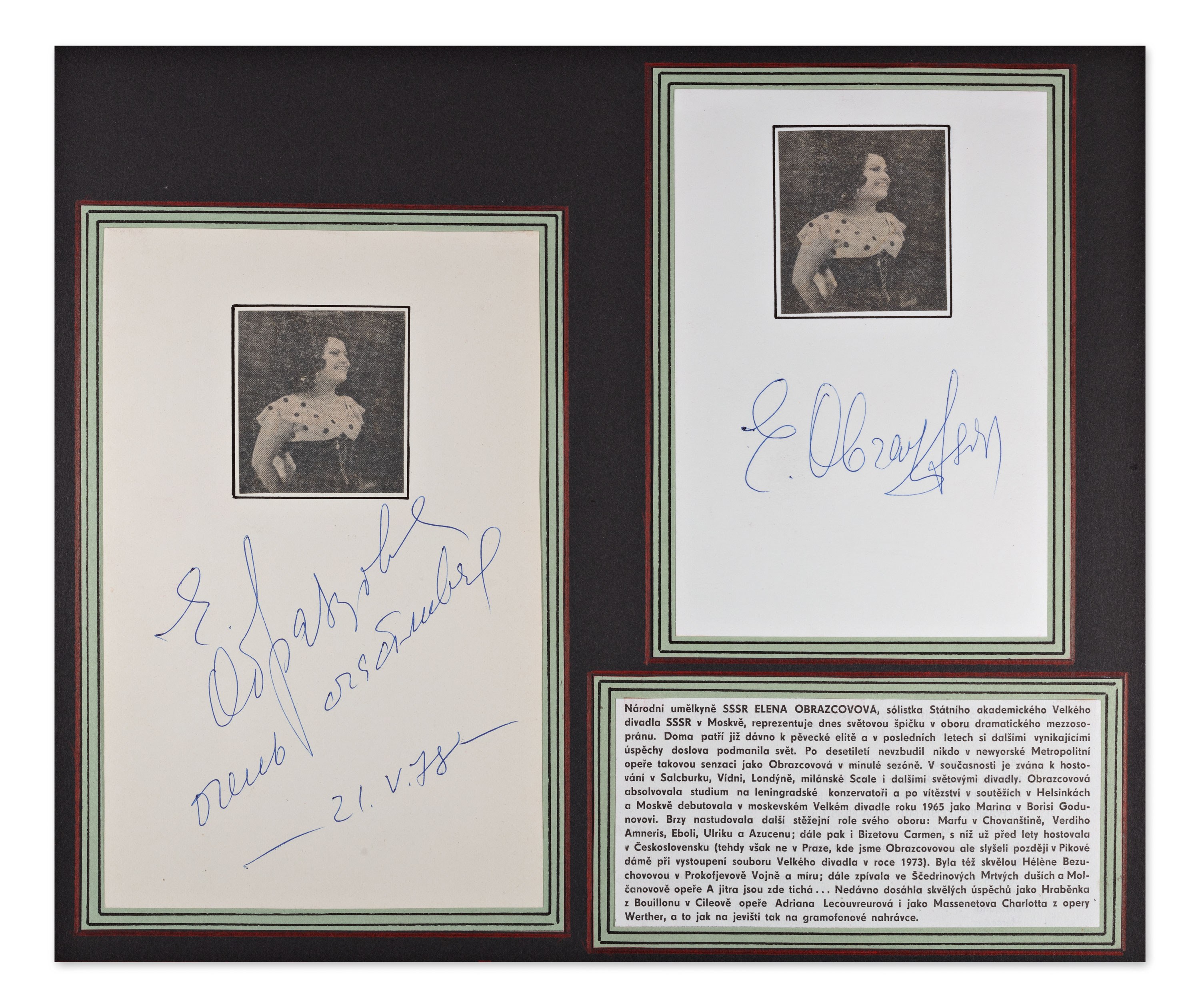 Set containing two cards with newspaper clippings and handwritten signatures of legendary Russian opera singer Elena Vasilievna Obraztsova, one of the most renowned mezzo-sopranos of the 20th century.Obraztsova was a soloist at the Bolshoi Theatre in Moscow and gained international acclaim for her dramatic mezzo-soprano roles. Her career spanned the world’s leading opera stages, including the Metropolitan Opera, La Scala, Covent Garden, and the Wiener Staatsoper.
