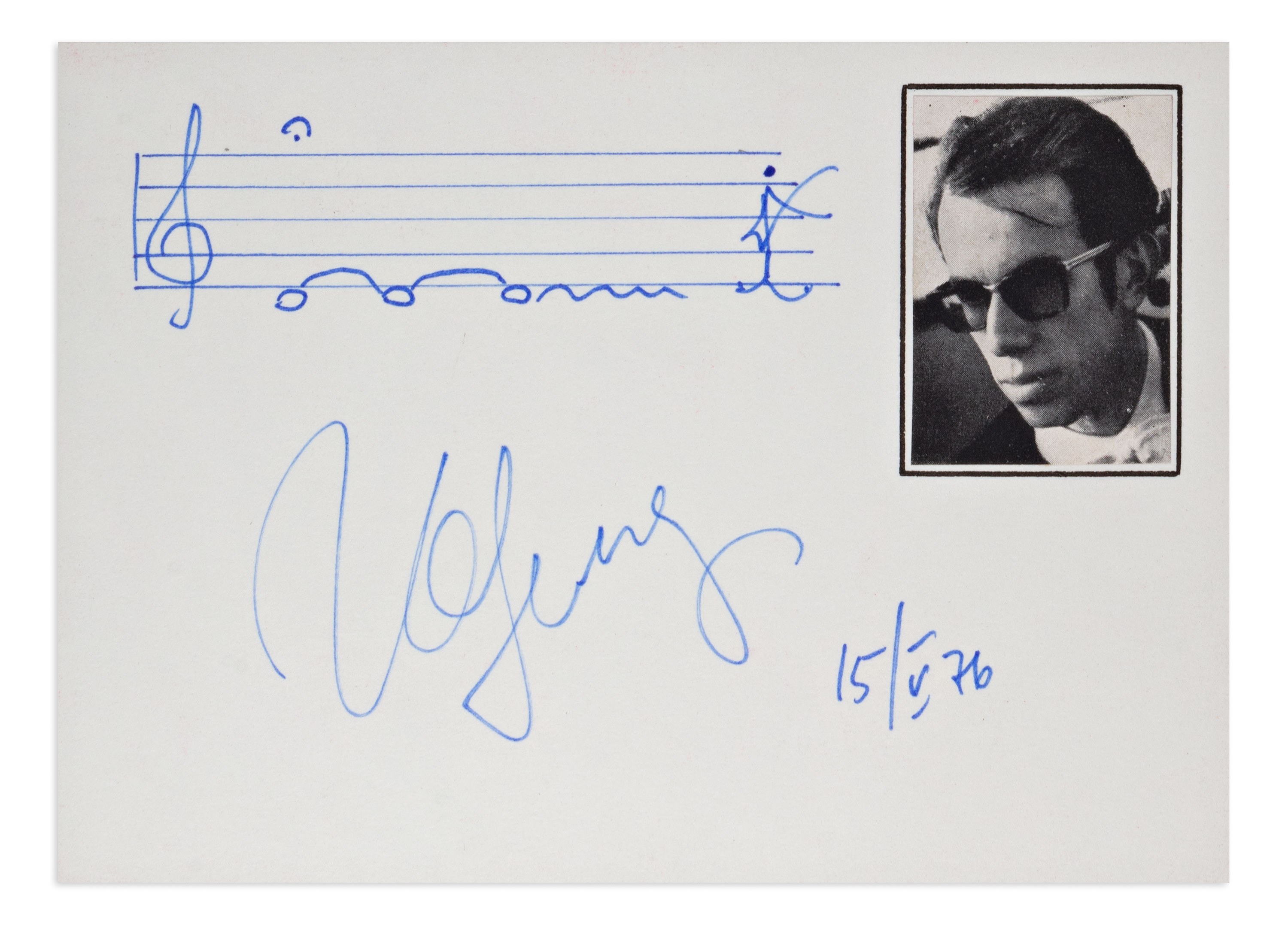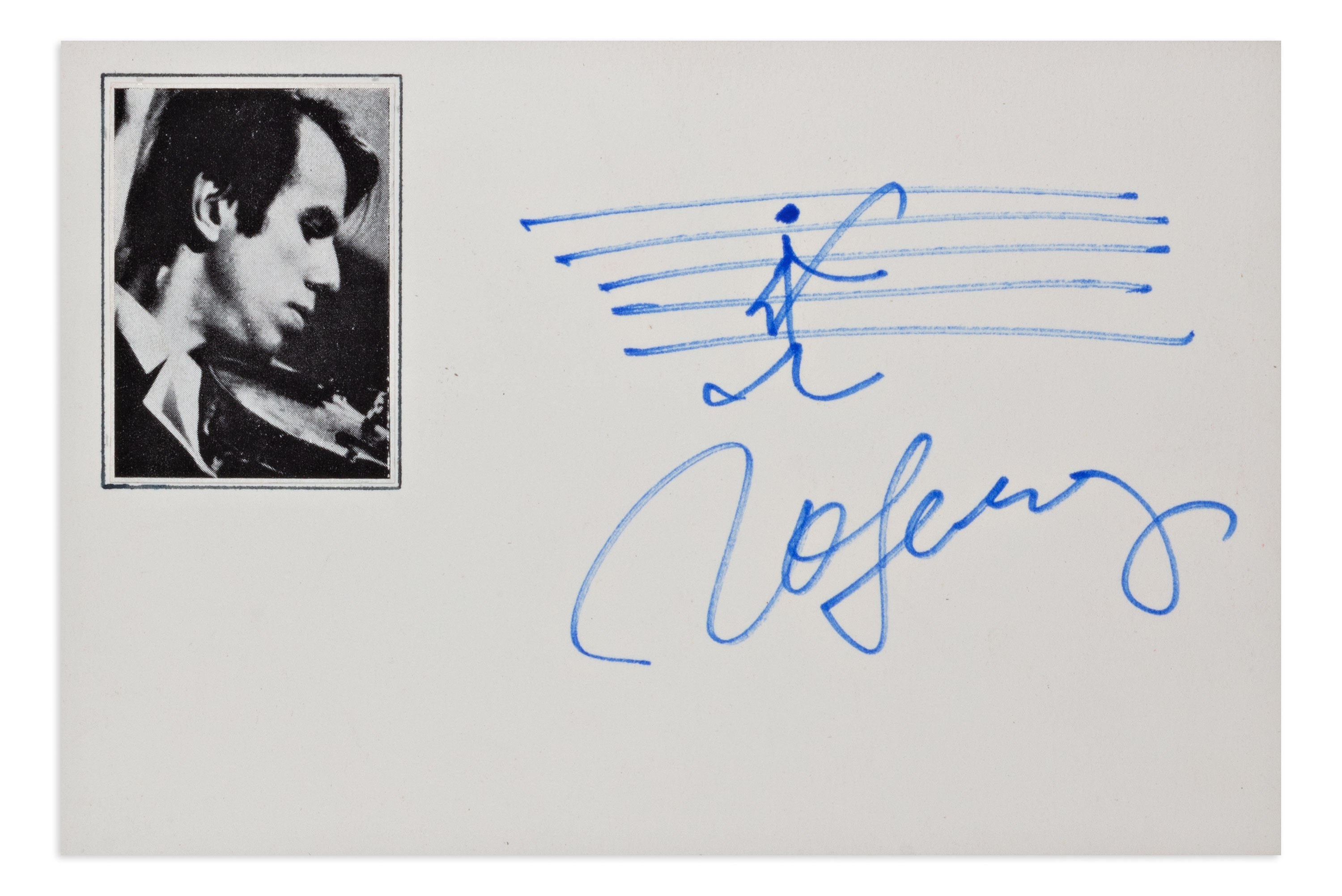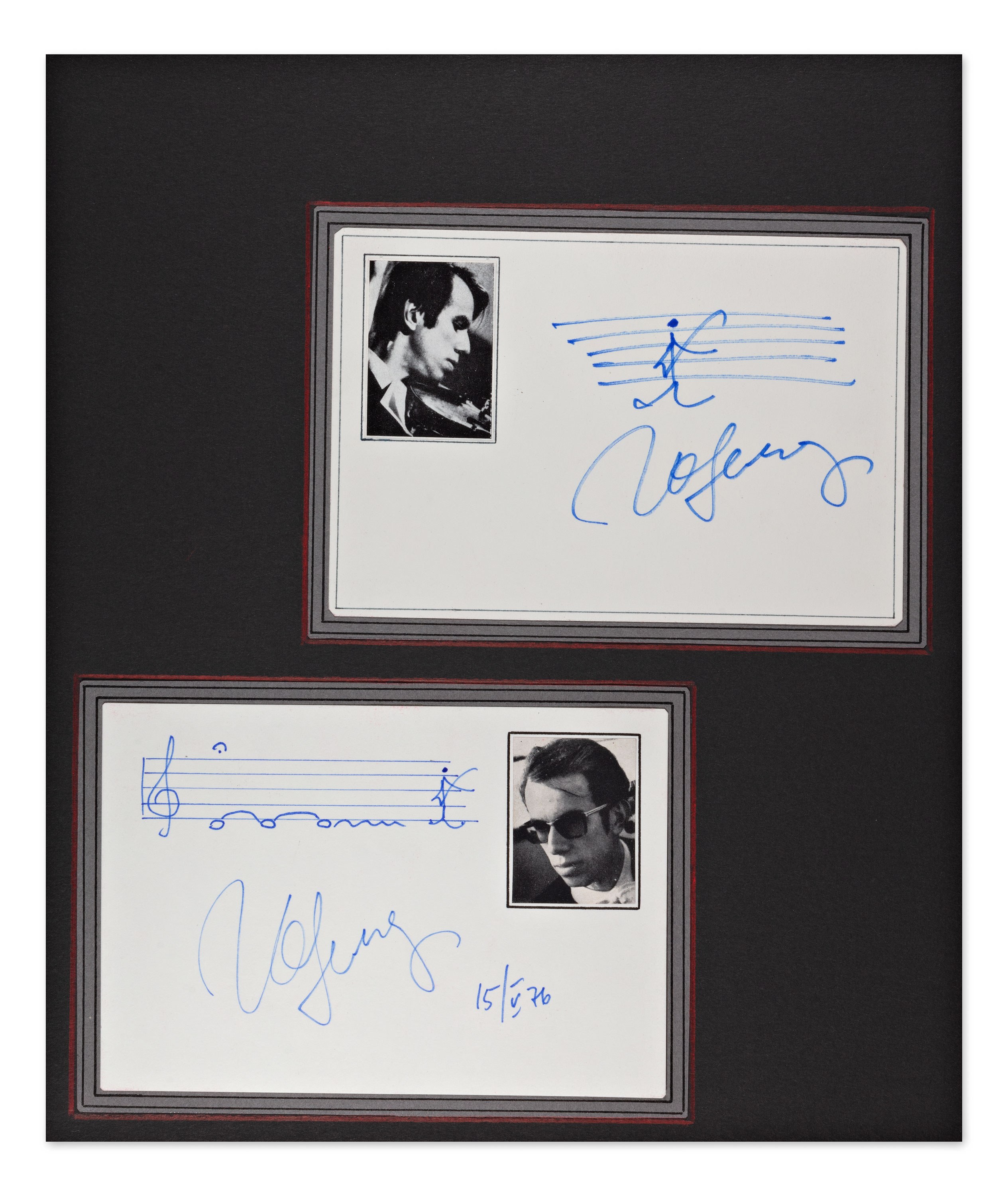 Set of two handwritten signed cards by Gidon Kremer, the legendary Latvian-German violinist, considered one of the most esteemed interpreters of the 20th and 21st centuries.Both cards include musical notation, a stylized drawing of the violinist, and a small portrait photograph of Kremer.