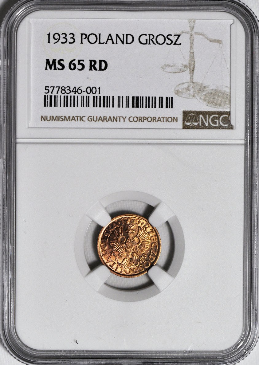 Moneta w najbardziej poszukiwanym czerwonym kolorze - RD (RED). Wyśmienity bez obiegowy egzemplarz, mocny połysk menniczy wpadający w lustro. W archiwum onebid znajduje się tylko jedna groszówka z 1933 w kolorze RD, w nocie o punkt gradingowy wyższej, która została sprzedana za 22.120zl