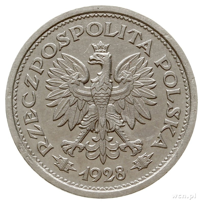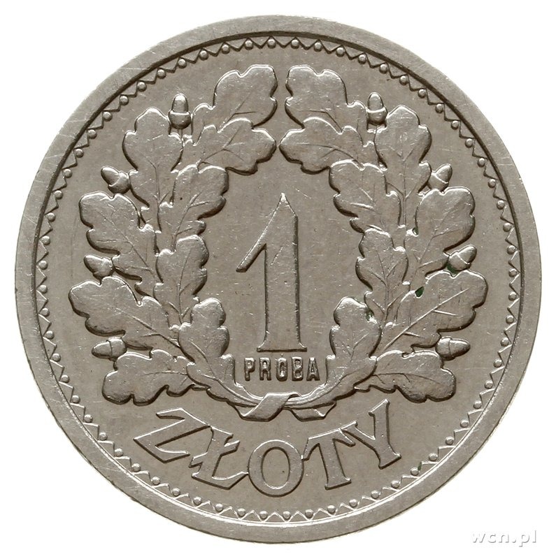 monety próbne, 1 złoty 1928, Warszawa, napis PRÓBA pod nominałem, w otoku wieniec z liści dębowy; nikiel 7.01 g; Parchimowicz P.126.d (100 sztuk); rzadkie i bardzo ładnie zachowane