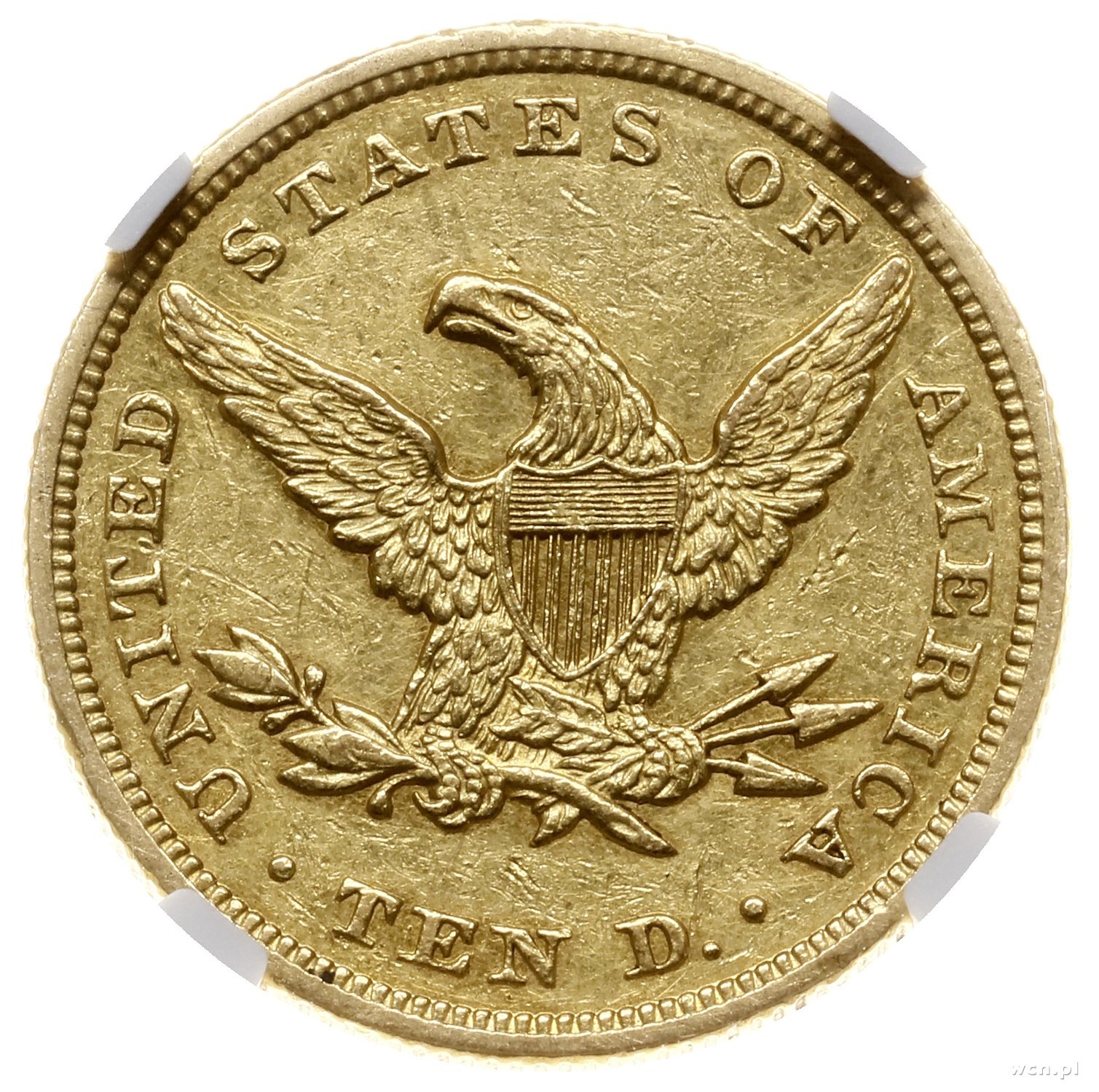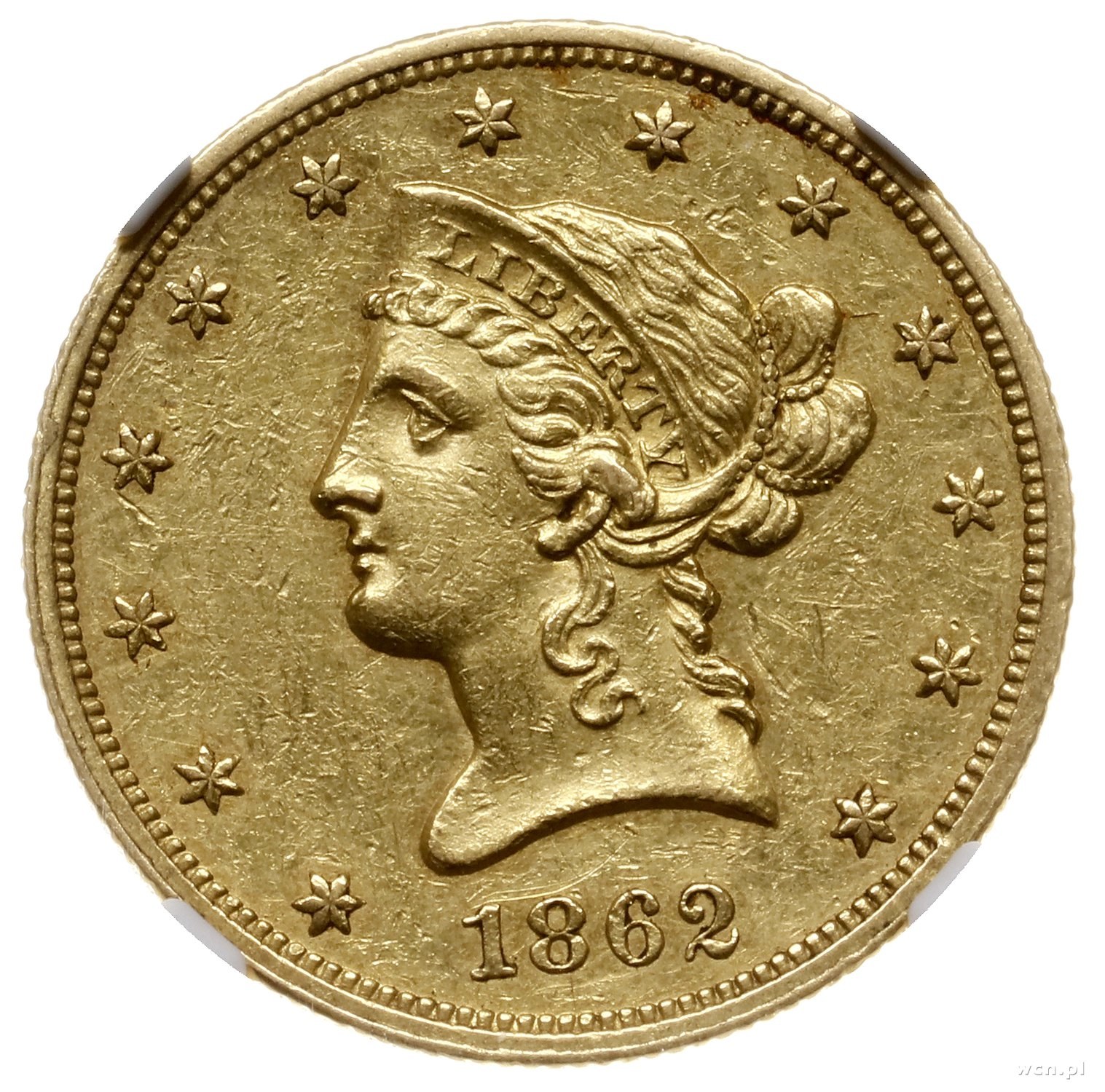 Stany Zjednoczone Ameryki (USA), 10 dolarów, 1862, mennica Filadelfia; typ Liberty head with Coronet, large Head, Eagle without motto; Fr. 155, KM 66.2; złoto próby 900, ok. 16.7 g, nakład: 10.960 sztuk; moneta w pudełku firmy NGC nr 5776215-005 z oceną AU55; rzadkie i ładnie zachowane.