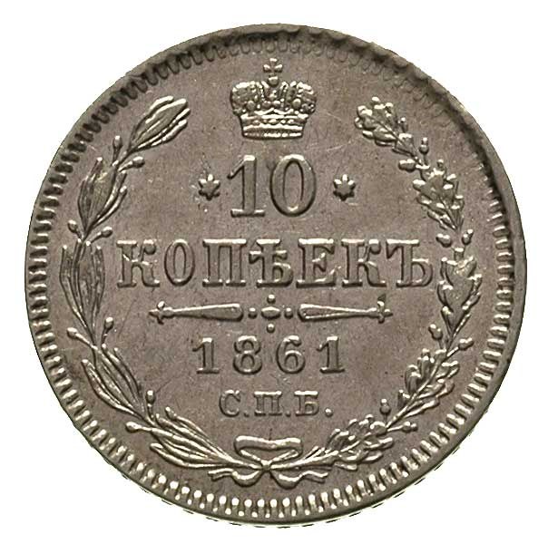 Aleksander II 1855-1881, 10 kopiejek 1861, Petersburg, Bitkin - , nienotowana odmiana bez literek mincerza, rzadkie