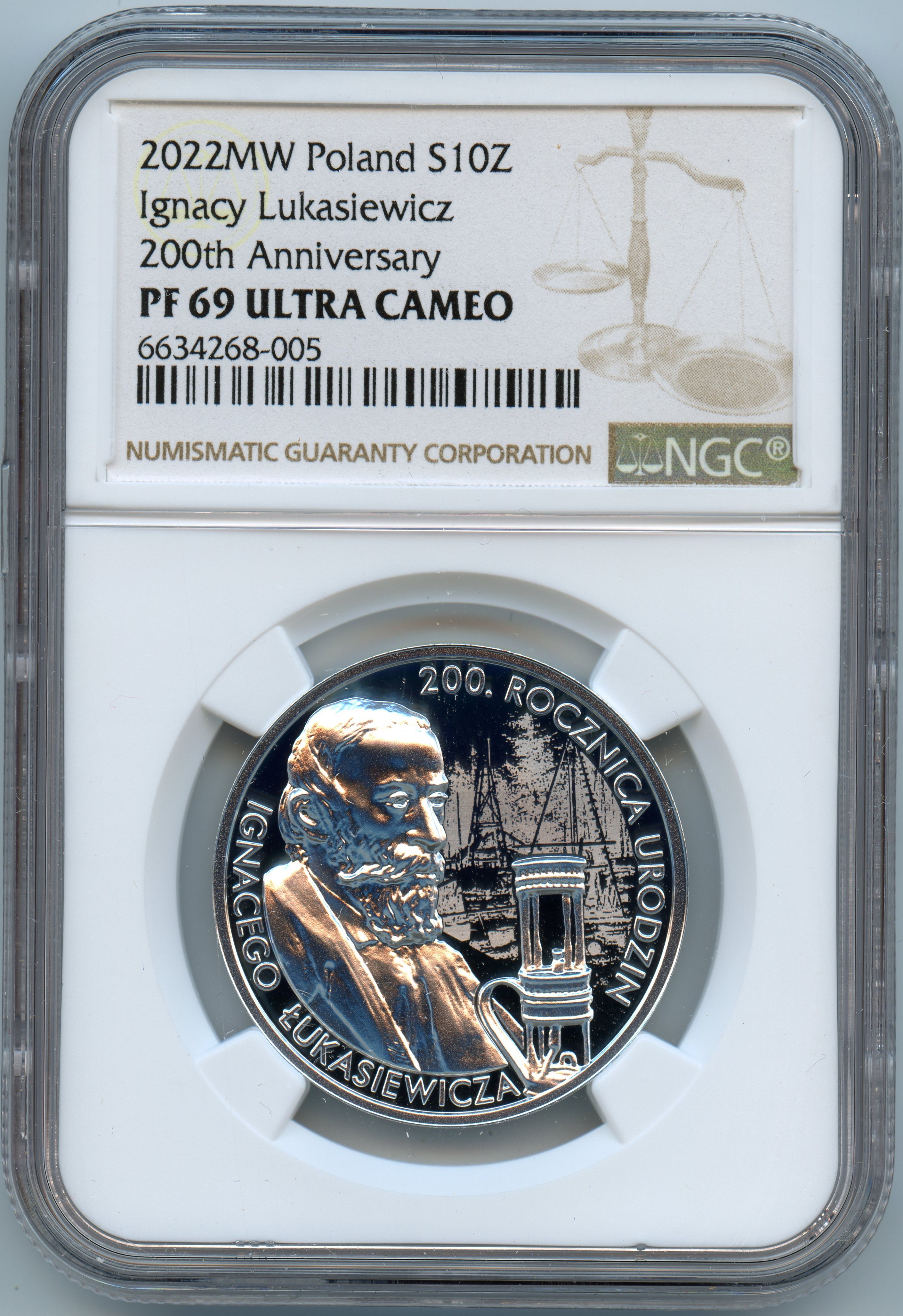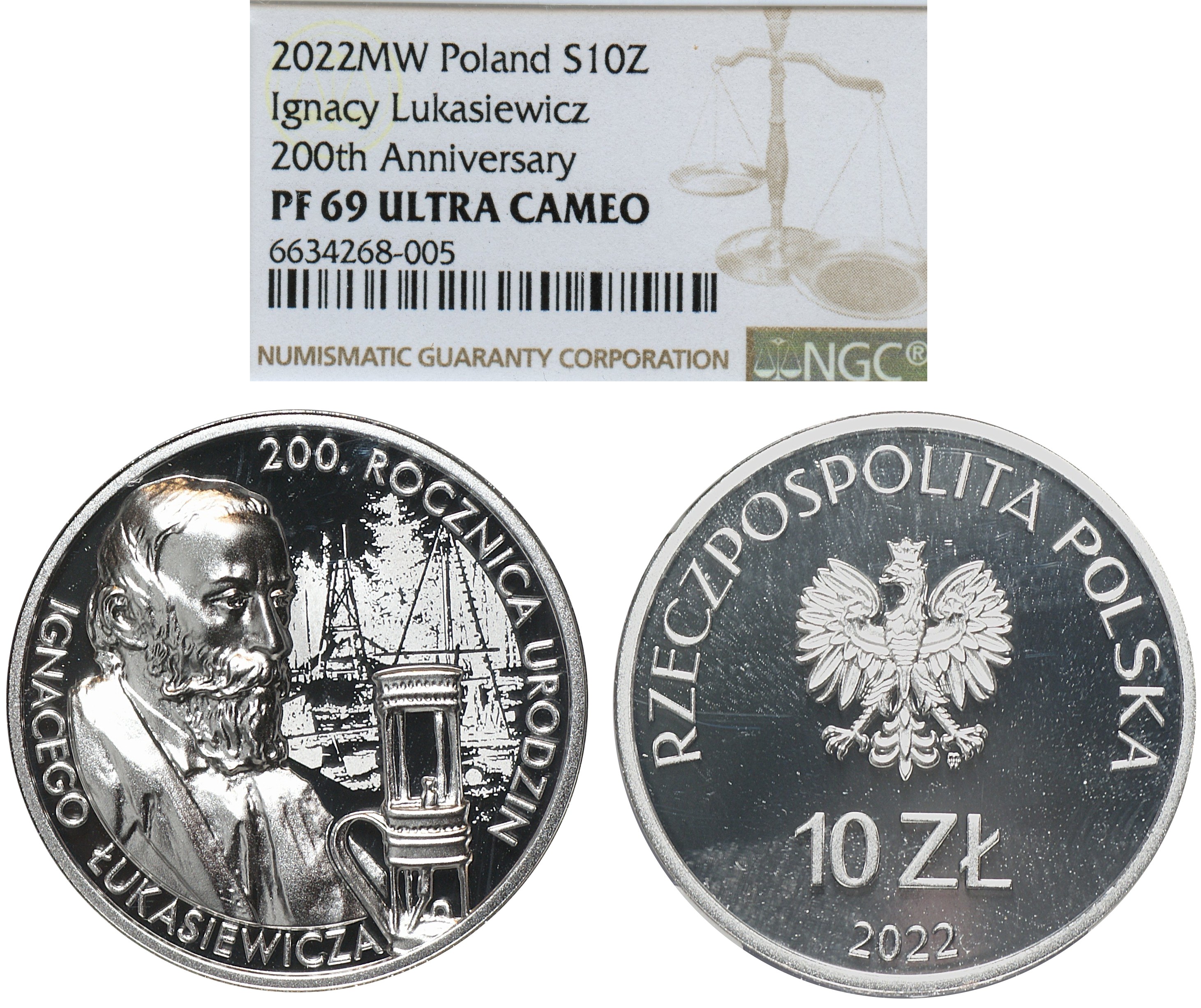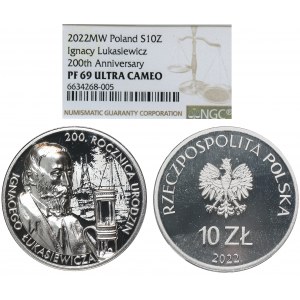 10 złotych 2022 - 200. rocznica urodzin Ignacego Łukasiewicza - NGC PF69 ULTRA CAMEO