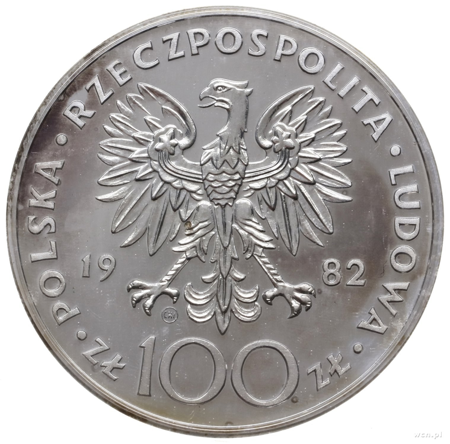 monety obiegowe, 100 złotych 1982, mennica w Szwajcarii; Jan Paweł II; Parchimowicz 294a; wybite stemplem zwykłym, nakład 8.700 sztuk, miejscowa patyna, pięknie zachowana moneta w pudełku NBP z certyfikatem