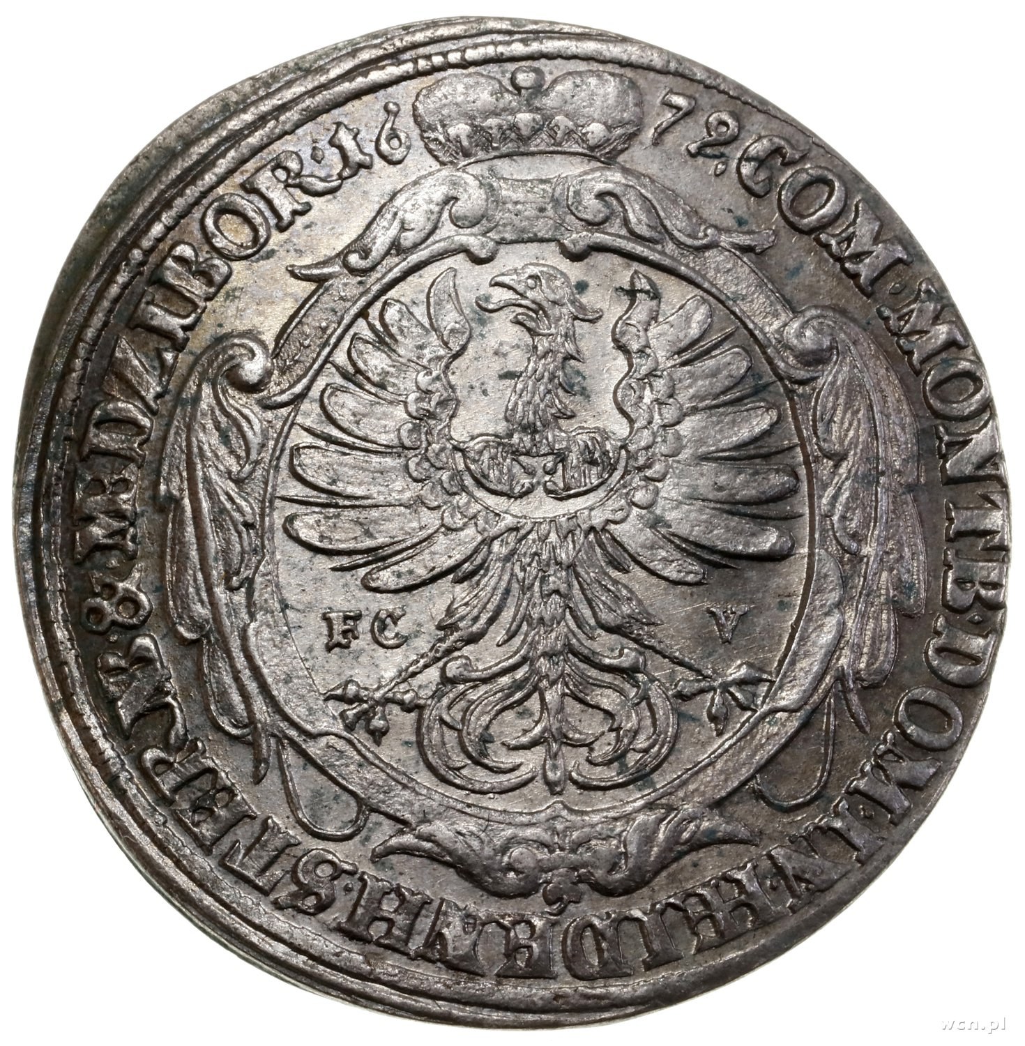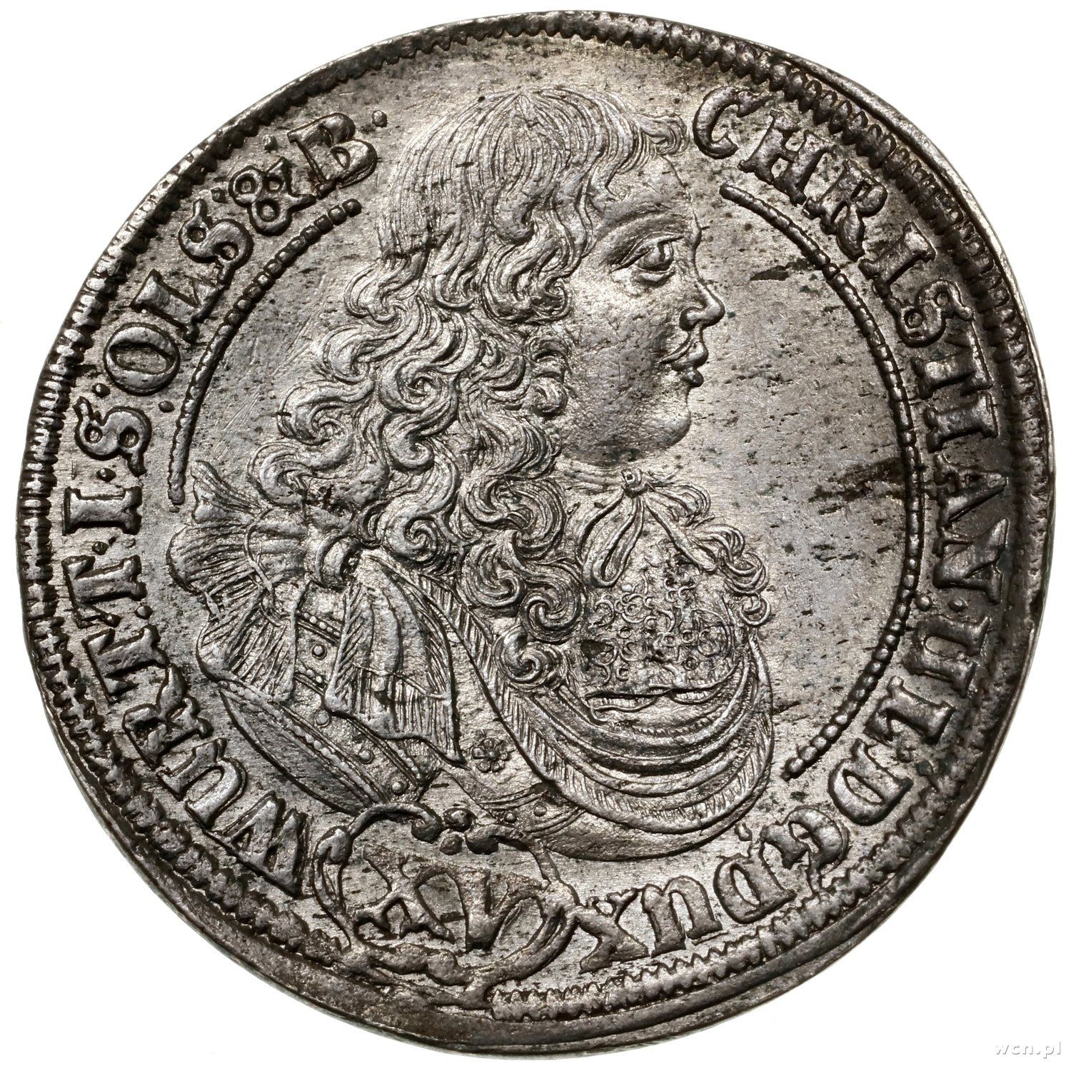 Krystian Ulryk (1668–1704), 15 krajcarów, 1679, Oleśnica; odmiana z dłuższym napisem otokowym rewersu z końcówką MEDZIBOR; E.-M. 176 (R1), F.u.S. 2357, Kop. 6297 (R1); delikatne wygięcie monety, charakterystyczne dla monet wybijanych z walca, rzadkie i ładnie zachowane.
