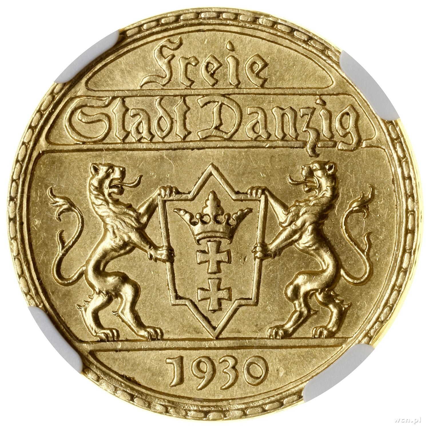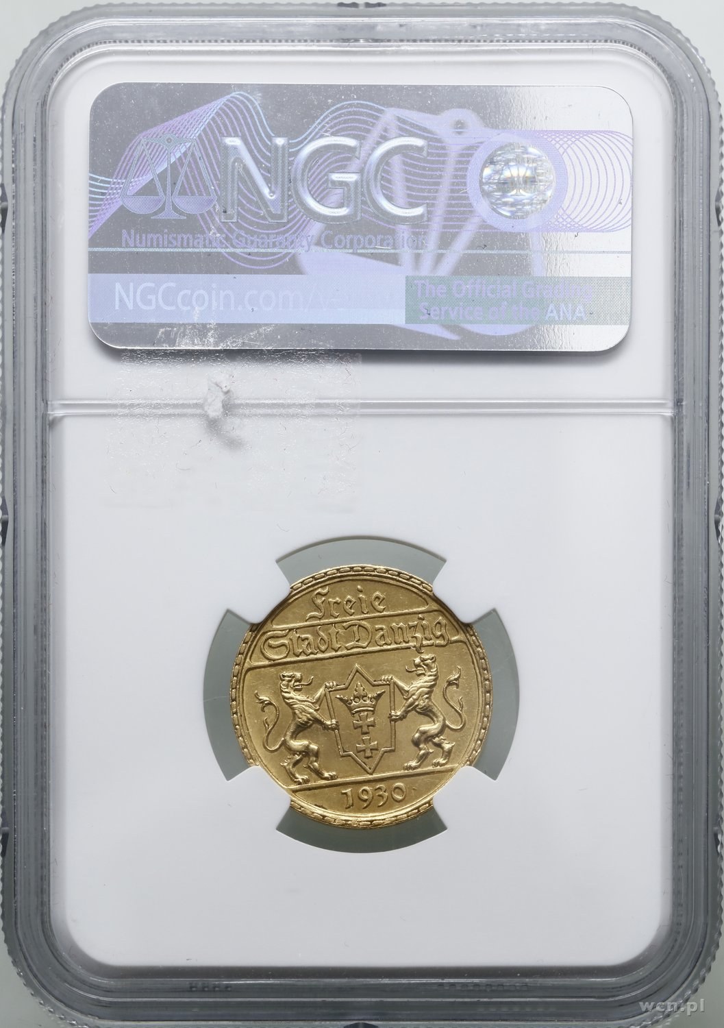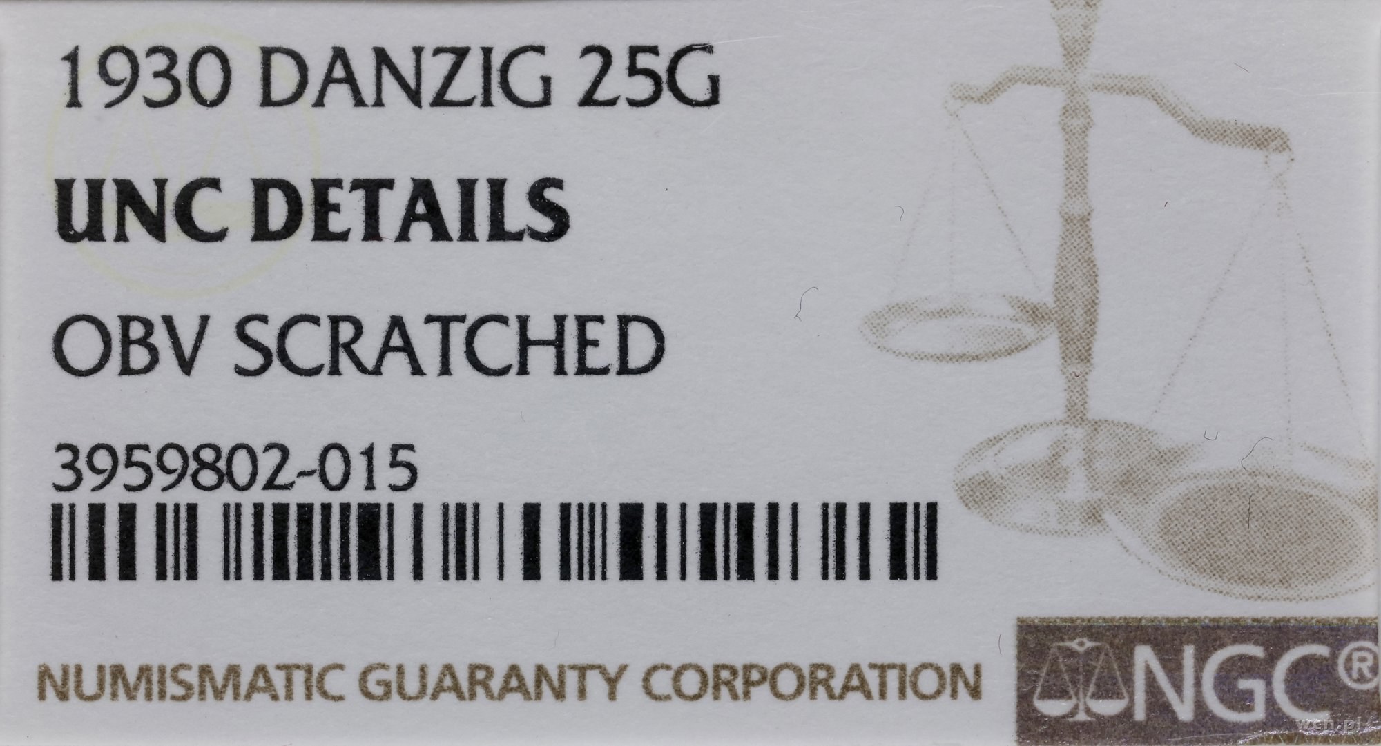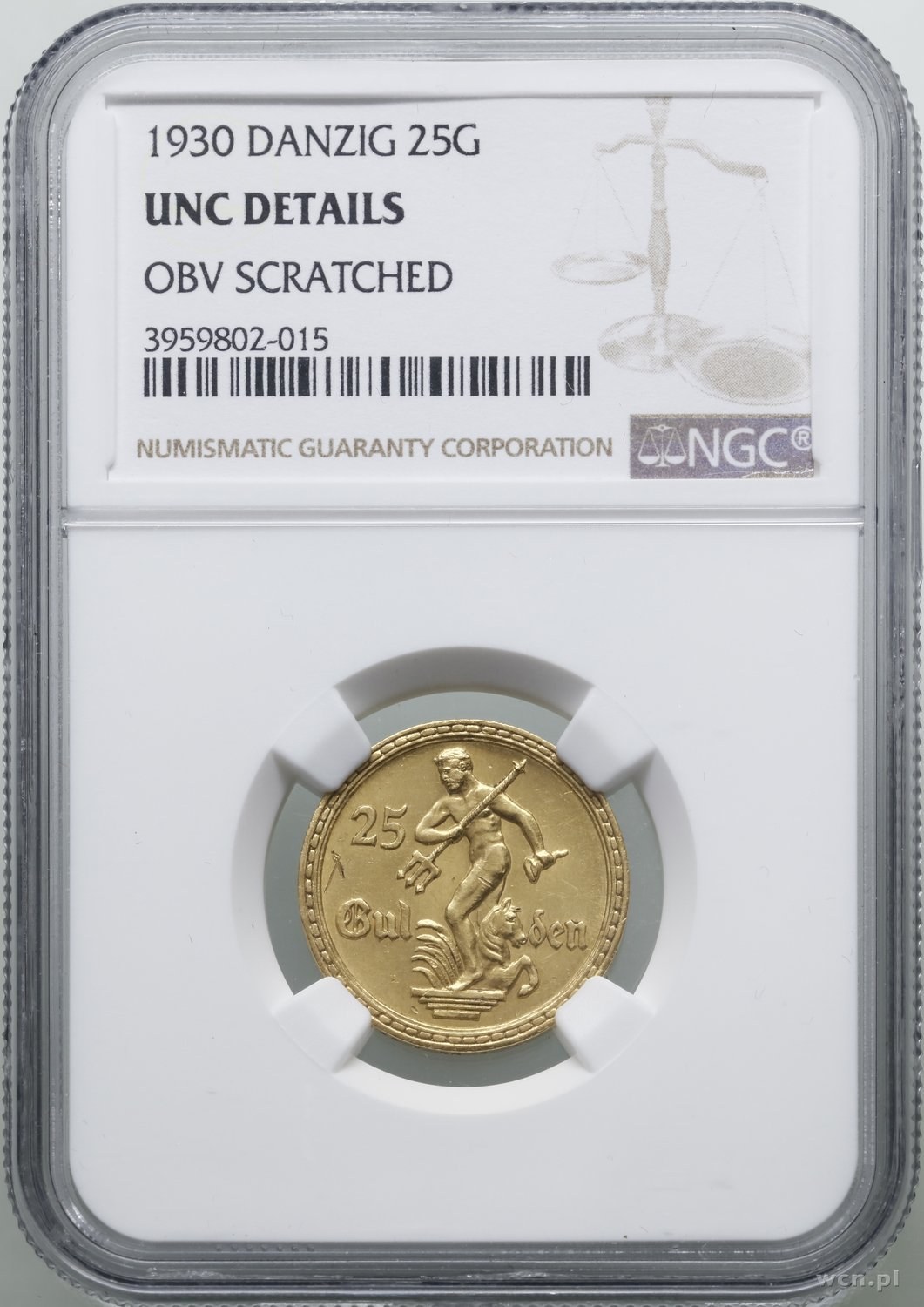 Wolne Miasto Gdańsk (1920–1939), 25 guldenów, 1930, Berlin; Posąg Neptuna; CNG 526, Fr. 44, Jaeger D.11, Parchimowicz 71; złoto; drobne rysy na rewersie, ale pięknie zachowana moneta wybita stemplami zwykłymi w pudełku firmy NGC 3859802-015 z oceną UNC DETAILS oraz adnotacja OBV SCRATCHED, wybita w nakładzie 4.000 egzemplarzy, nie wprowadzona do obiegu.