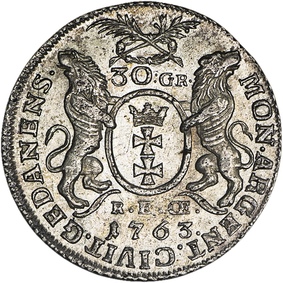 Rw: Herb Gdańska z dwoma lwami po bokach, pod wieńcem z dwoma gałązkami i nominałem 30:GR, pod nim R•E•OE• 1763., w otoku: MON•ARGENT•CIVIT•GEDNANENS•