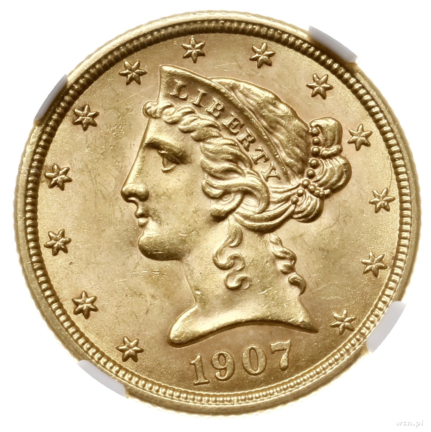 Stany Zjednoczone Ameryki (USA), 5 dolarów, 1907, mennica Filadelfia; typ Liberty with Coronet, motto above Eagle; Fr. 143, KM 101; złoto próby 900, ok. 8.35 g, nakład: 626.100 sztuk; moneta w pudełku firmy NGC nr 5776215-001 z oceną MS62, pięknie zachowana.