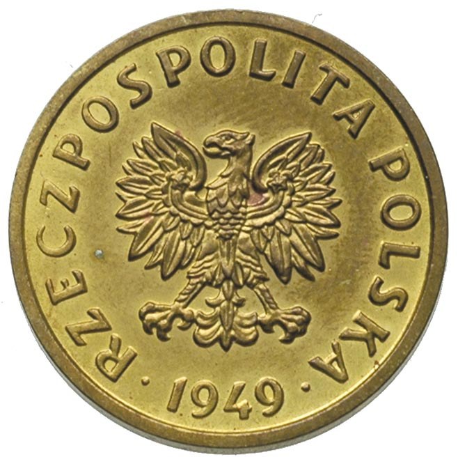 5 groszy 1949, Warszawa, na rewersie wklęsły napis PRÓB...