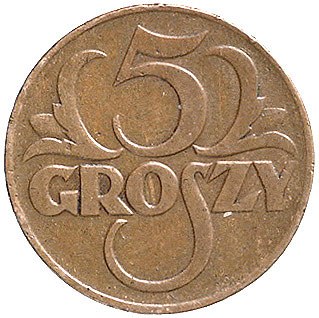 Rzeczpospolita Polska 1918-1939, 5 groszy międzywojenne wybite tylko jednostronnie, z powodu niższej wagi (2,68 g) oraz mniejszej grubości krążka odbity został tylko rewers, ciekawostka numizmatyczna