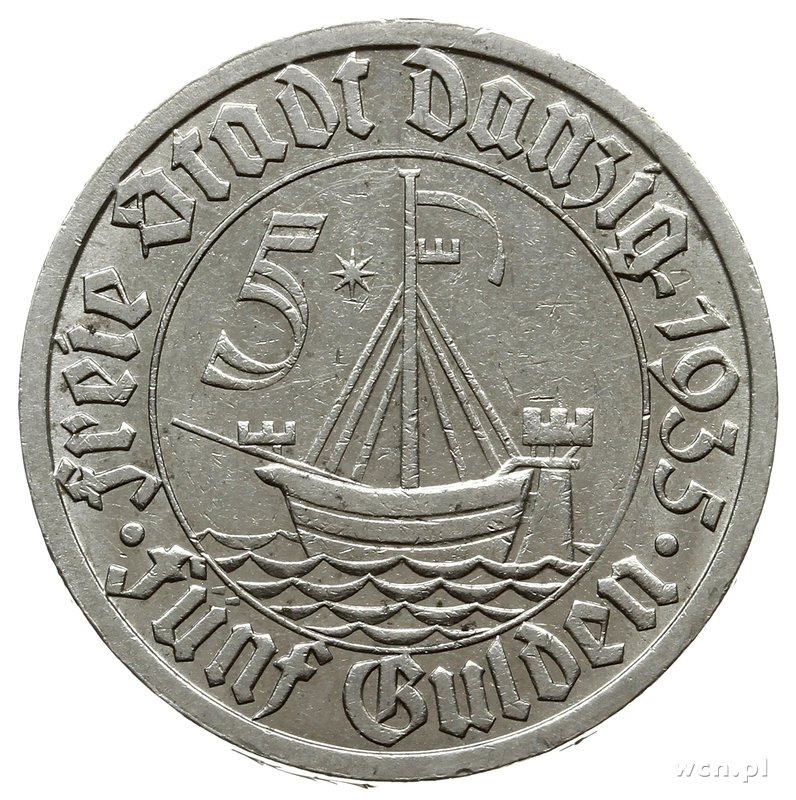 Wolne Miasto Gdańsk 1920-1939, 5 guldenów 1935, Berlin; “Koga”; CNG 523, Jaeger D.19, Parchimowicz 68; bardzo ładne.