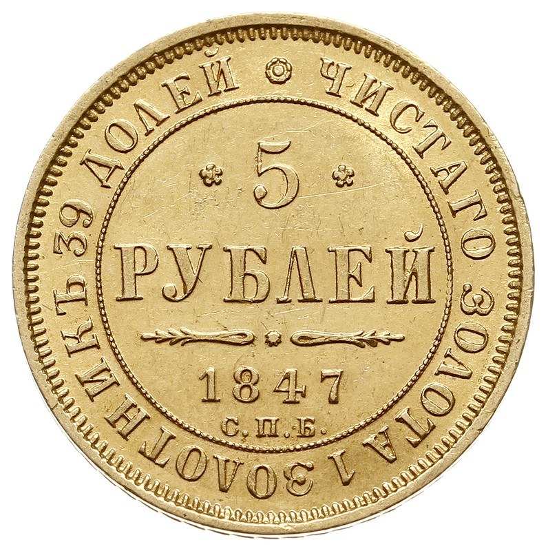 5 rubli 1847 / СПБ АГ, Petersburg, złoto 6.52 g, Bitkin...