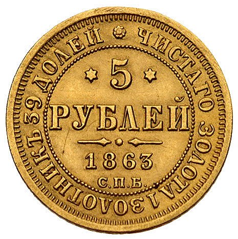 5 rubli 1863. Petersburg, Bitkin 9, Fr. 163, złoto 6.48...