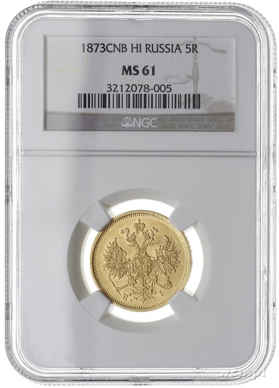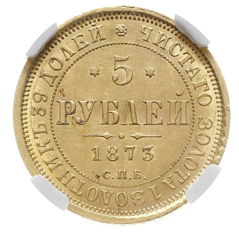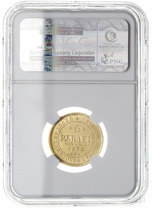 Aleksander II 1855-1881, 5 rubli 1873 СПБ НI, Petersburg, złoto, Bitkin 21, Fr. 163, moneta w pudełku NGC z certyfikatem MS61, pięknie zachowane
