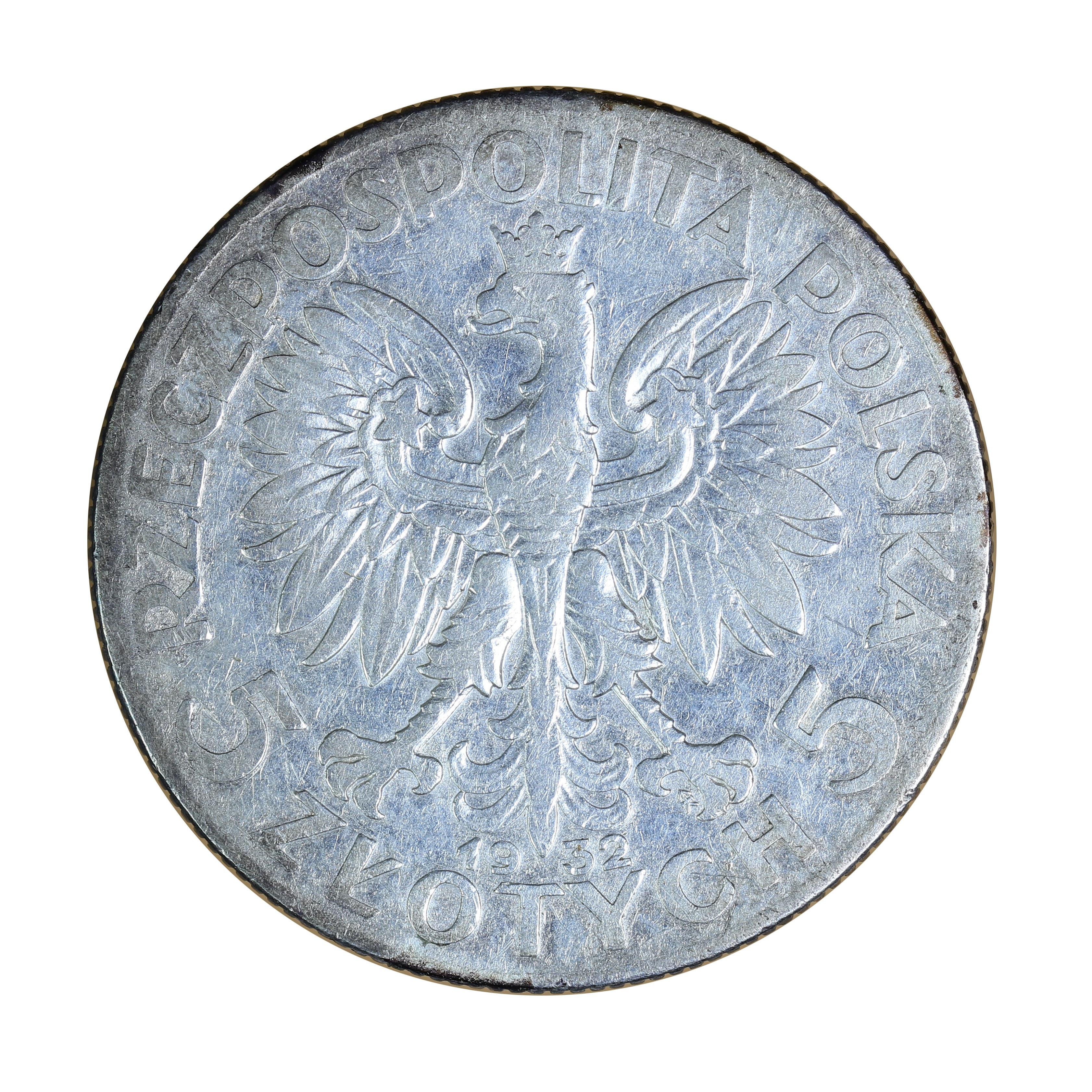 5 złotych 1932 r., ze znakiem, głowa kobiety, II Rzeczpospolita Polska 1923-1929