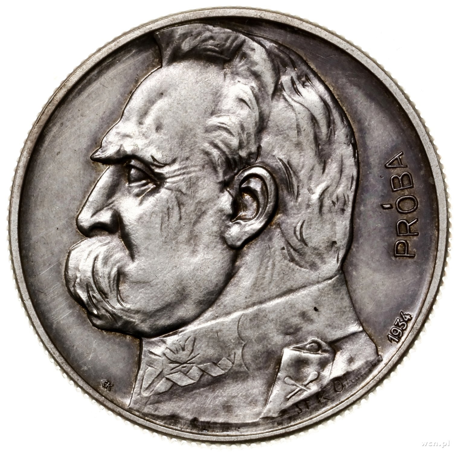 monety próbne, 5 złotych, 1934, Warszawa; Józef Piłsudski - Orzeł Strzelecki”, na rewersie wypukły napis PRÓBA; Parchimowicz P146a; srebro 11.00 g, ciemna patyna, pięknie zachowane. Moneta projektu Stanisława Ostrowskiego, wybita w nakładzie 100 sztuk.
