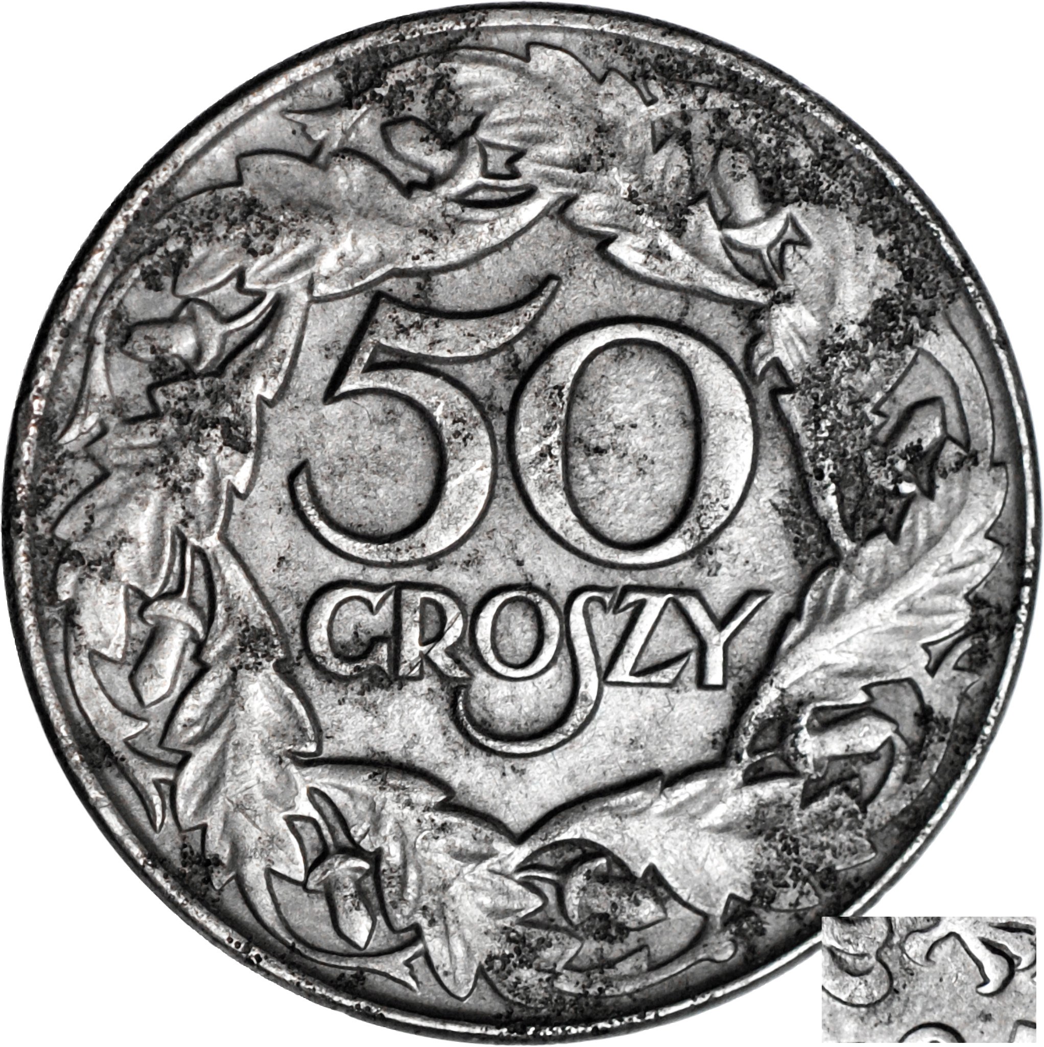 Rzadka moneta, dobra prezencja. Przyczyny wybicia monet bez znaku mennicy opisuje R. Koter w PN2/98 w artykule "Czy istnieją 50 groszówki z 1938 roku bez znaku mennicy?" - odmiana powstała na skutek menniczego uszkodzenia stempla, stąd słabo widoczny znak mennicy. Poszukiwana moneta. Ładny egzemplarz.