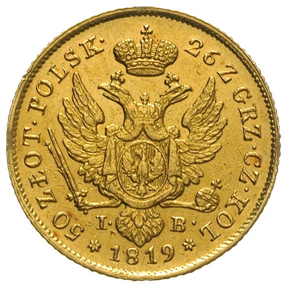 Aleksander I 1815-1825 i Mikołaj I 1825-1855, 50 złotych 1919, Warszawa, złoto 9.78 g, odmiana z wysokim rantem, Plage 4, Bitkin 807 (R), pięknie zachowane detale, rzadkie