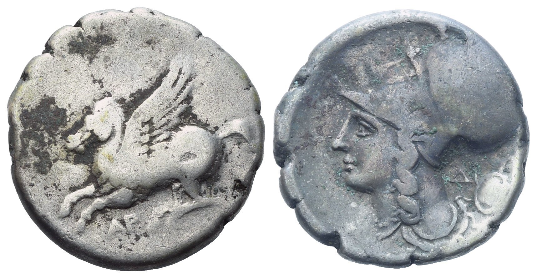 Pegasos flying l.; AP below; Rv. Helmeted head of Athena left; ΔΙ and shield to r. Pegasi 16; BCD Akarnania -; HGC 4, 786. VF